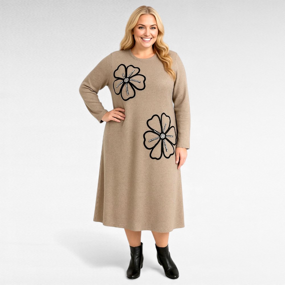Stiilne pilkupüüdva suure sätendavate kivikestega kaunistatud lillemustriga kootud kleit Itaaliast – soe elegants sügiseks ja talveks