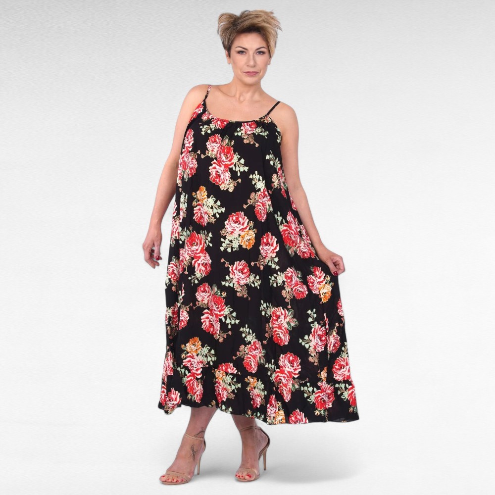Imekaunis must suure efektse värvilise lillemustriga õlapaeltega alt laieneva lõikega luksuslik maksikleit “Italy Collection”. Kleit on valmistatud väga kvaliteetsest hästilangevast mittekortsuvast materjalist.