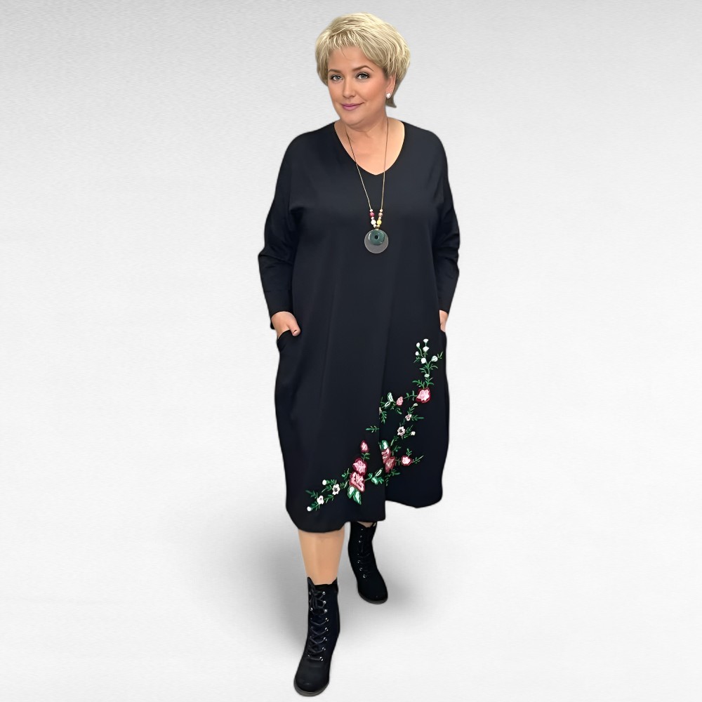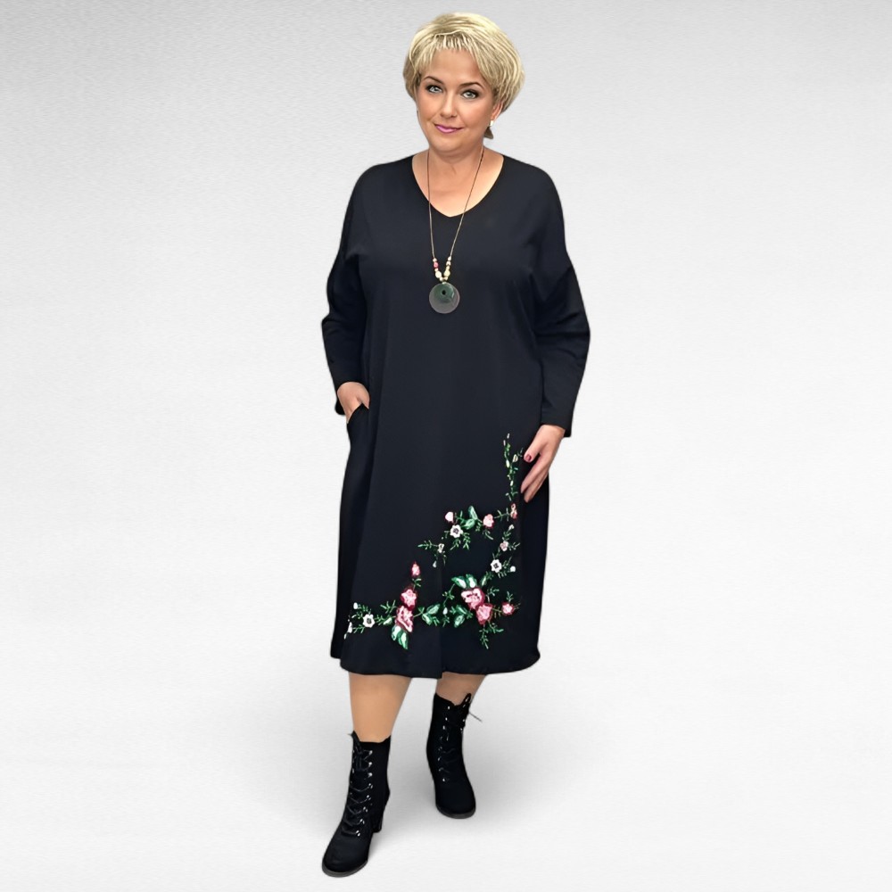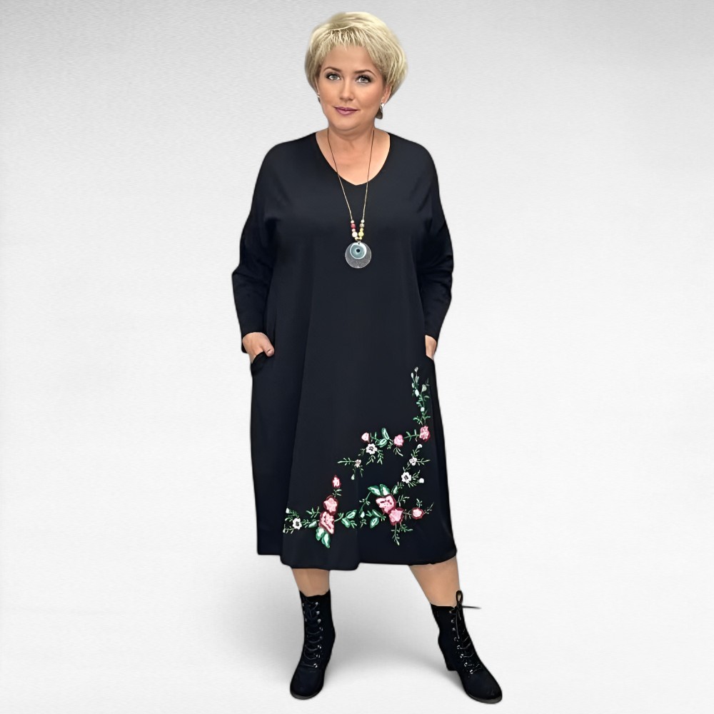 ✨ Must V-kaelusega tikanditega kleit “Silvi” – meie enda disain, mis ühendab mugavuse ja kauni välimuse. Nahasõbralik pehme puuvill koos elastaaniga pakub liikumisvabadust ja mõnusat kandmiskogemust. Vabaltlangev lõige, praktilised taskud ning roosa-ja rohelisekirju armas lilletikand annavad kleidile kordumatu ilme.