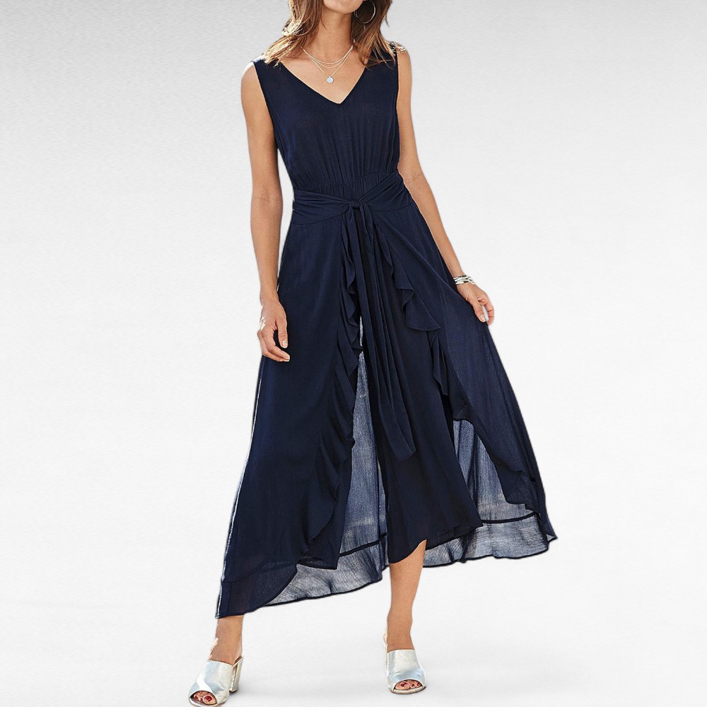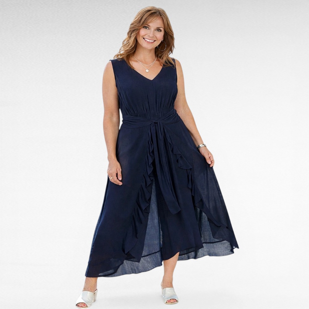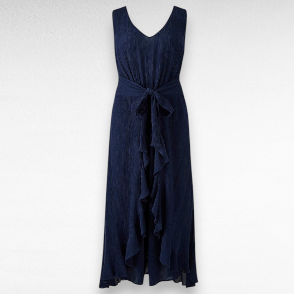 Stiilne tumesinine kortsuriidest jumpsuit Inglismaalt firmalt “Together”. Avara lõikega kolmveerandpikkusega püksteosa ning peal on laiade kokkuseotavate hõlmadega kleit. Vöökoht on kummiga, taga üleval kaeluse ääres nööp. Kõik on ühes tükis. Pehme nahasõbralik hingav viskooskangas.