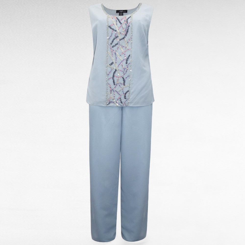 Pidulik helesinise varjundiga helehall 3-osaline kästitöötikandite ja helmestega ehitud kostüüm pikemale kasvule Inglismaalt firmalt “Midnight Velvet”. Komplekti kuuluvad sätendavate kaunistustega topp, pikad alt veidi laieneva lõikega püksid ja sätendavate helmestega pikk õhuline jakk/kardigan. Püksid on  värvlisosast kummiga, külje peal on lukk. Püksid on kahekordsest kangast ja läbi ei paista.