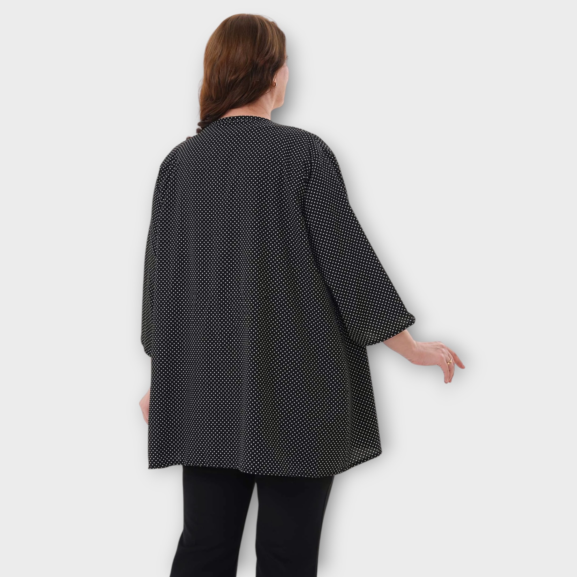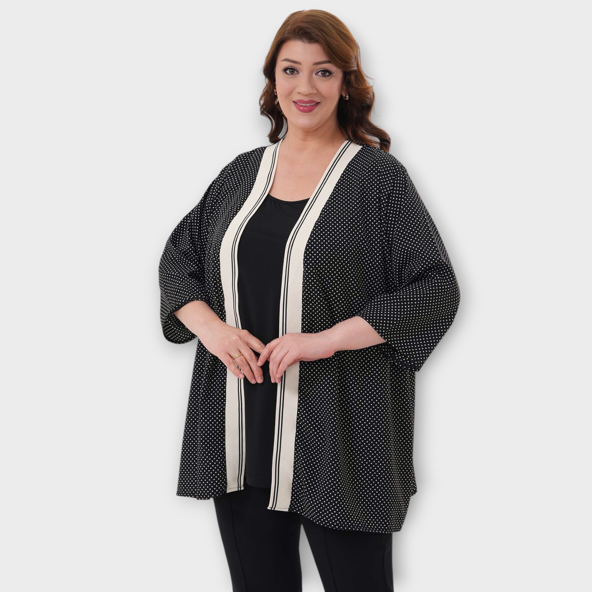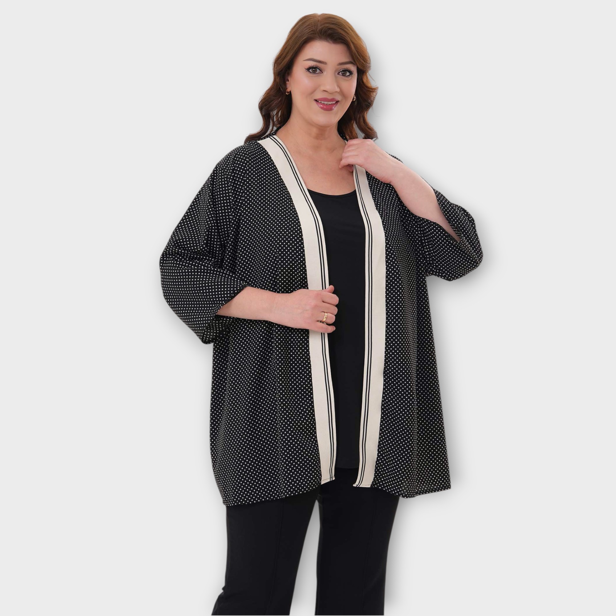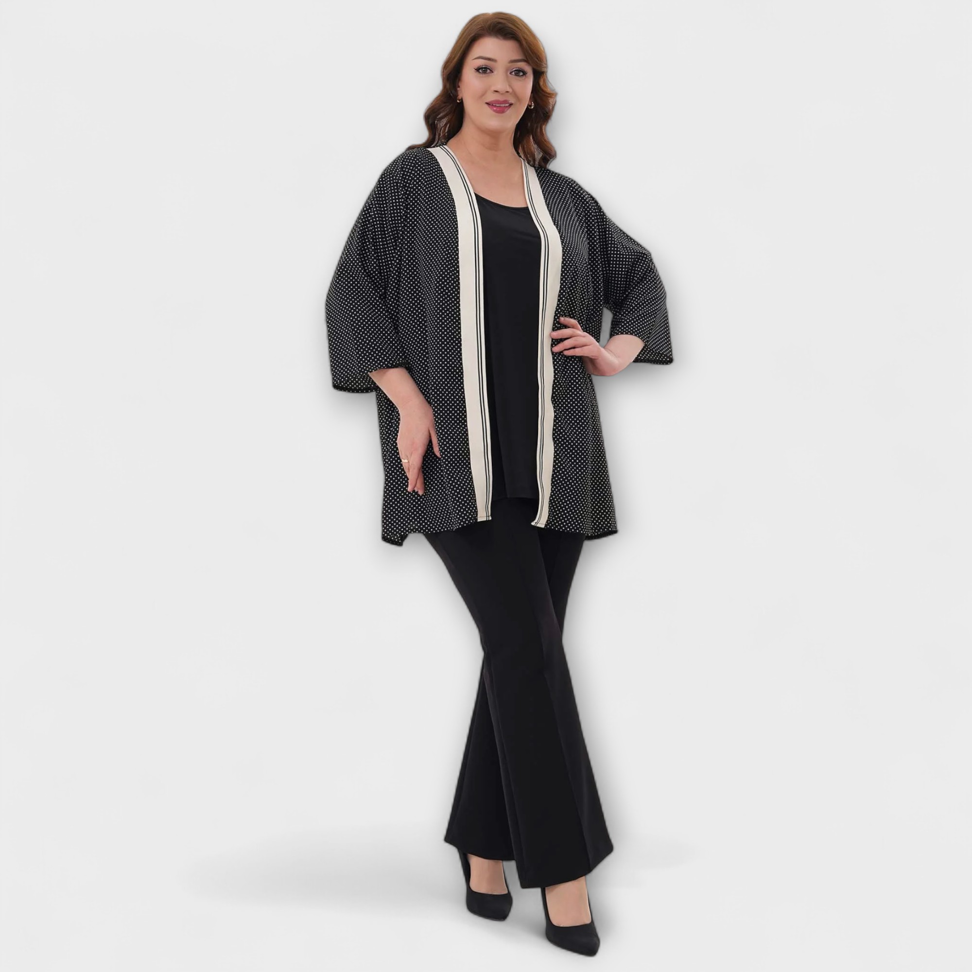 Naiselik must mummulise mustriga alt musta siidja topiga 2-osaline soliidne komplekt. Pikem must sirge lõikega top ning must valgemummulise mustriga eest valgete kantidega siidjas naiselik jakk. Kaunis komplekt nii vabaks ajaks kui ka pidulikuks puhuks. Mõlemat toodet saab kanda ka eraldi ja kombineerida teiste riietega.