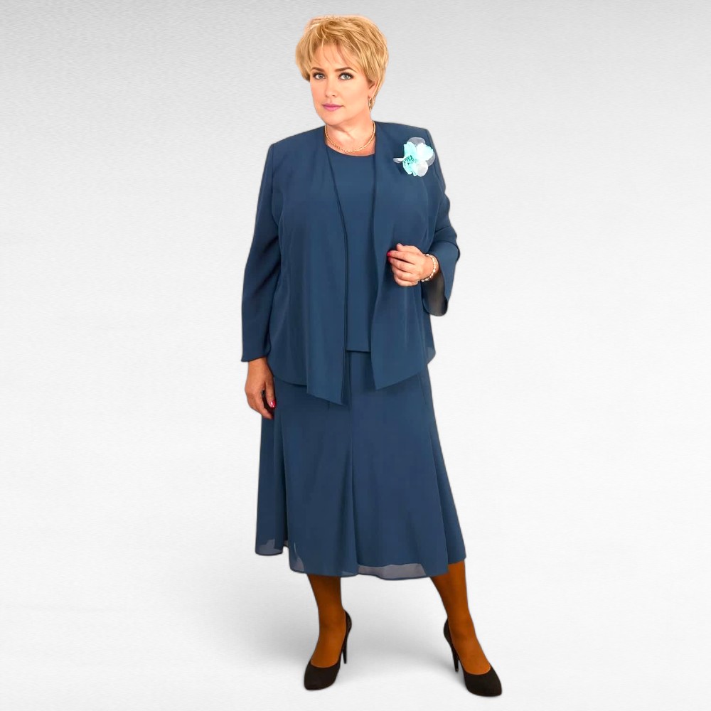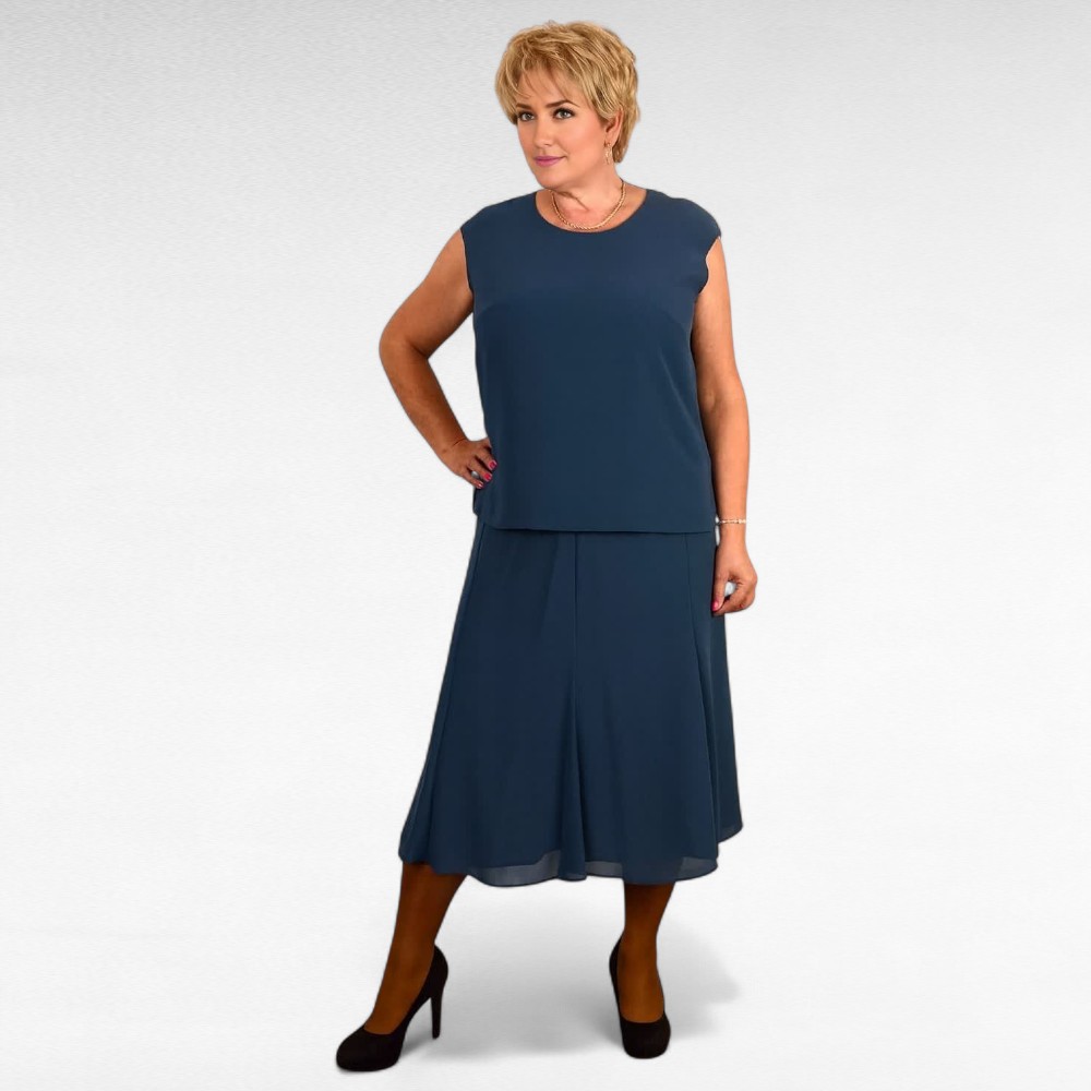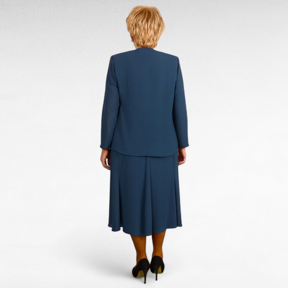 Väga kena mererohelist tooni naiseliku lõikega 3-osaline kvaliteetne rätpsepatööna valmistatud komplekt – alt väikese satsiga ilma varrukateta al voodriga top, lahtiste hõlmadega pikkade varrukatega siidjas jakk ja alt laienev seelik. Seelik on alt voodriga, keskelt kummiga ja alt laienevate paanidega, hästilangevast mittekortsuvast kangast. Kõiki asju saab kombineerida ka paljude teiste riietega, väga praktiline ja naiselik komplekt.