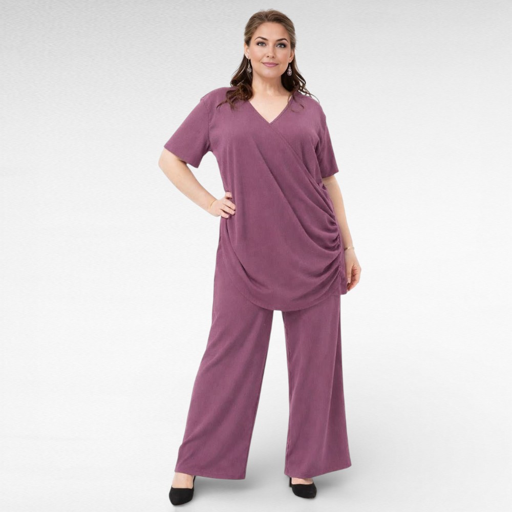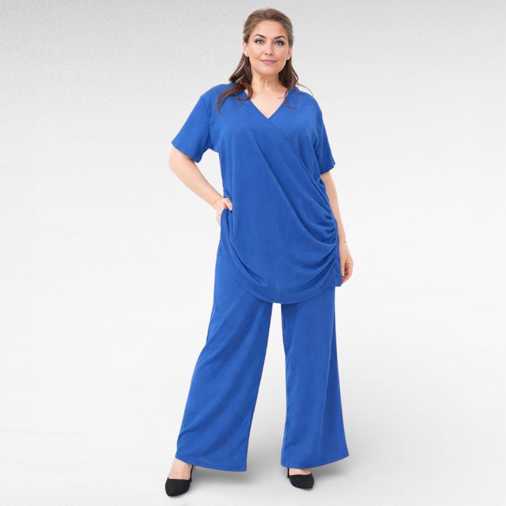Kaunis ja naiselik 2-osaline pluss suuruses  pika hõlmiklõikelise tuunikaga ja alt laienevate pükstega kortsuriidest soliidne komplekt. Püksid on taskutega, keskelt kummi ja tunnelvööga. Tuunika on hõlmiklõikega, V-kaelusega. Hõlmik istub seljas hästi, lahti ei kisu kusagilt ja liiga avar dekoltee ka ei jää. Külg on ühelt poolt kroogitud ja rinnaosa langeb vabalt. Materjal on kortsuriidesarnane, pehme. Tuunika on eest veidi pikem kui tagant ja eest on altäär kaarjas.
