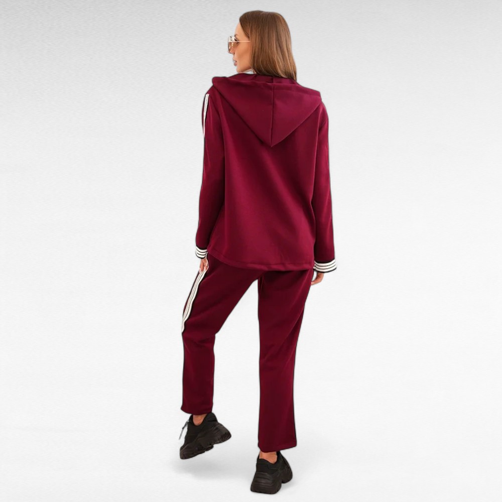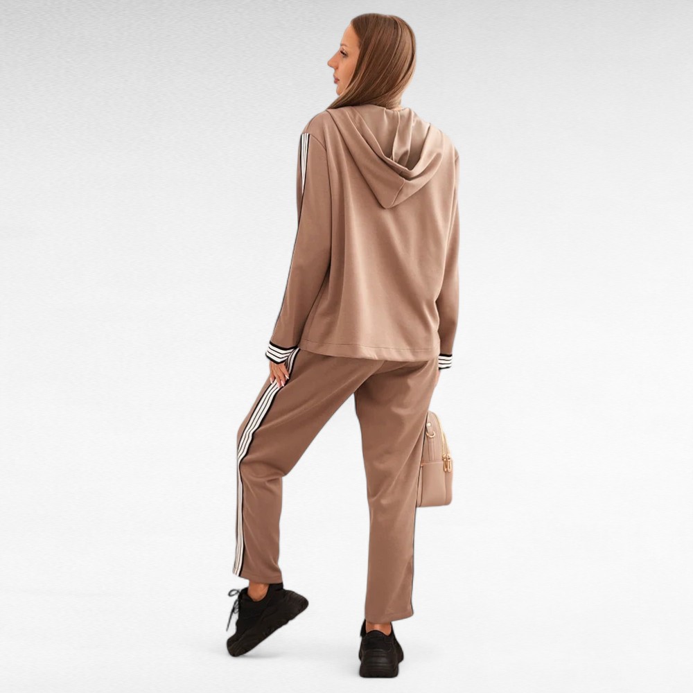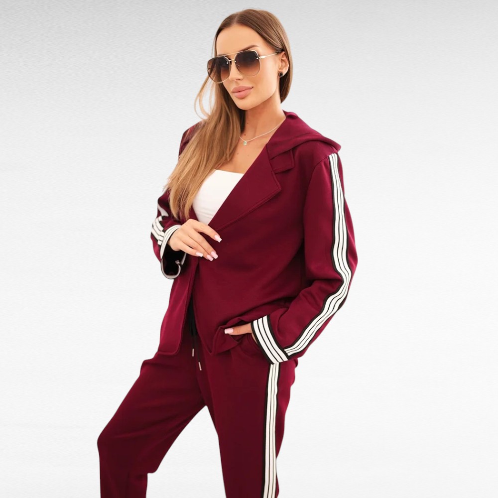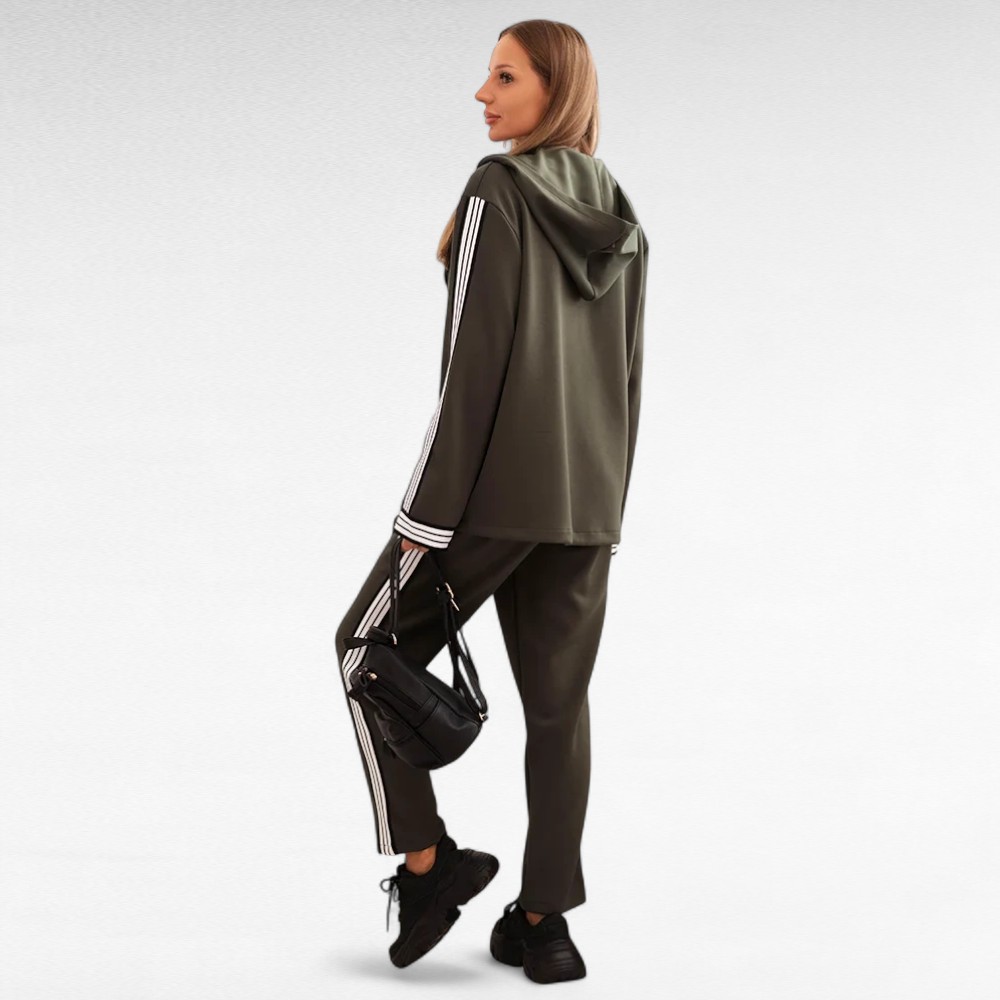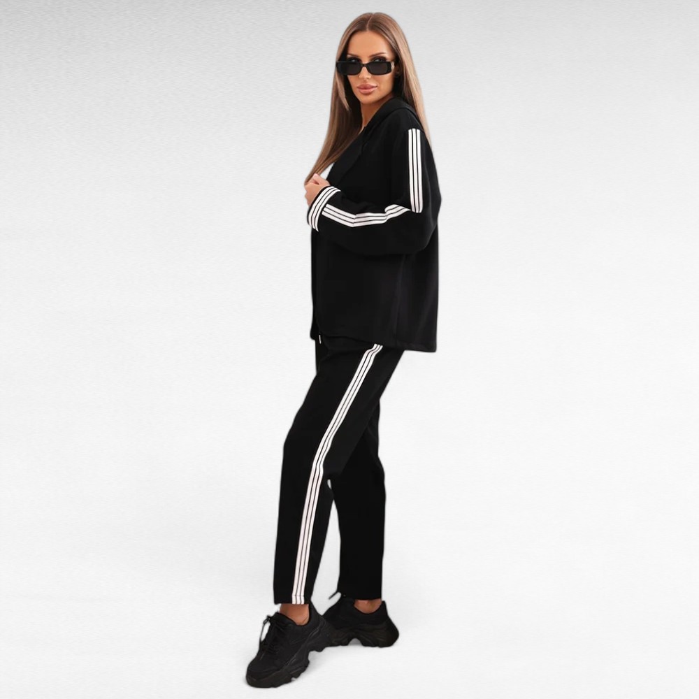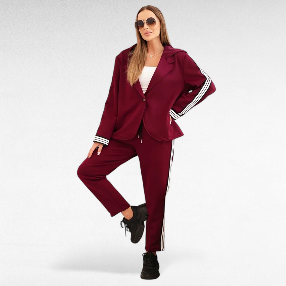 Kui hindad vabadust, enesekindlust ja moekat välimust, on see komplekt loodud just sulle. Sportlik jakk avara lõike ja varrukaid kaunistavate kontrasttriipudega sobib ideaalselt kokku pükstega, millel on elastne värvel ja küljetriibud. Koos loovad need igapäevase, kuid samas šiki koosluse – sobiv nii linnamelu nautimiseks, sõbrannadega kohvitamiseks kui ka vabamas stiilis töö- või ärikohtumisteks.