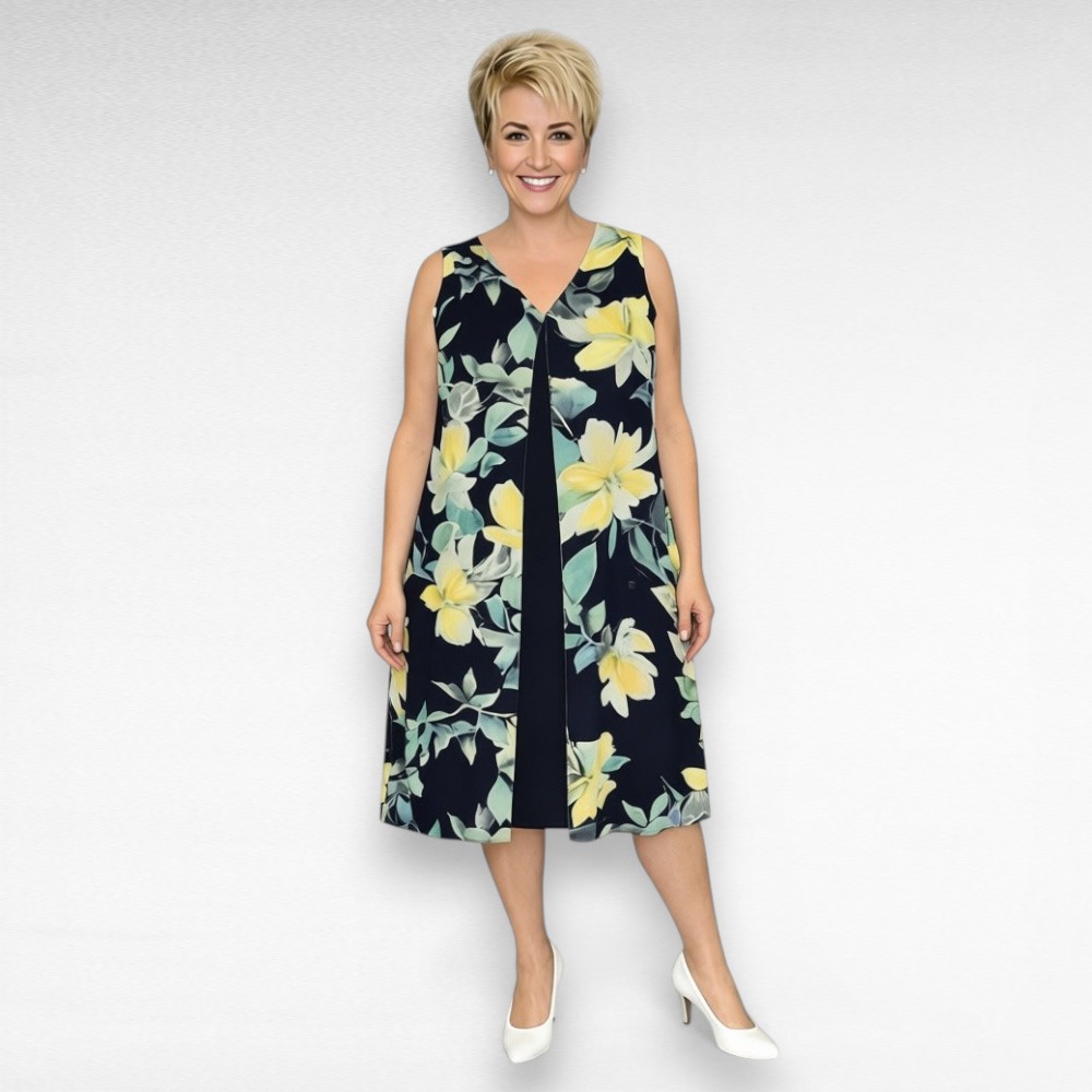 Kahekihiline kollaselillelise mustriga pluss suuruses naiste suvekleit Inglismaalt firmalt “Evans”. Alumine osa on venivast materjalist, peal eest lahtine polüestematerjalist kangas. Pikkus jääb veidi üle põlve. Varjab kõik, mida näidata ei raatsi.