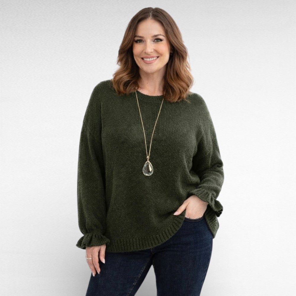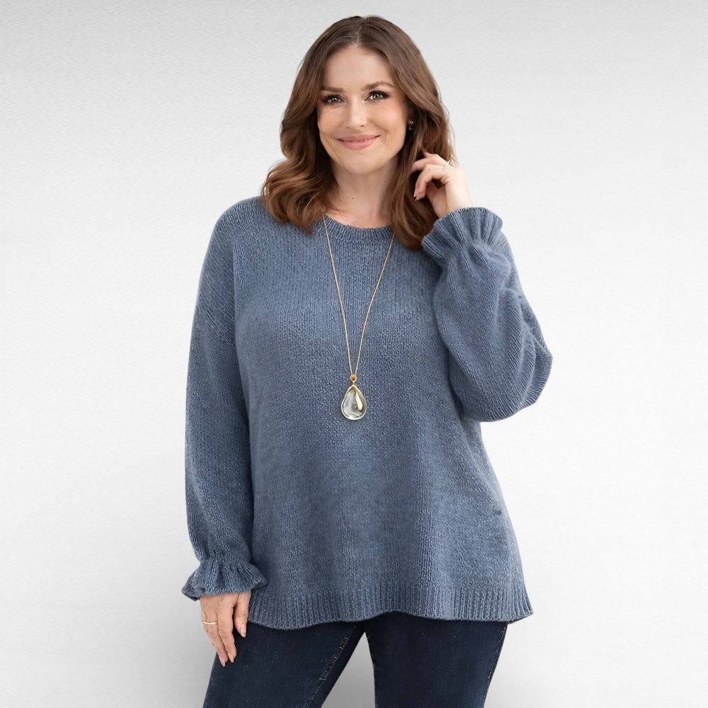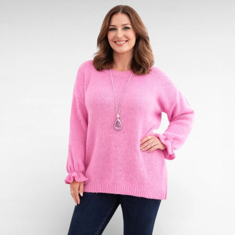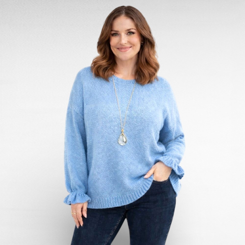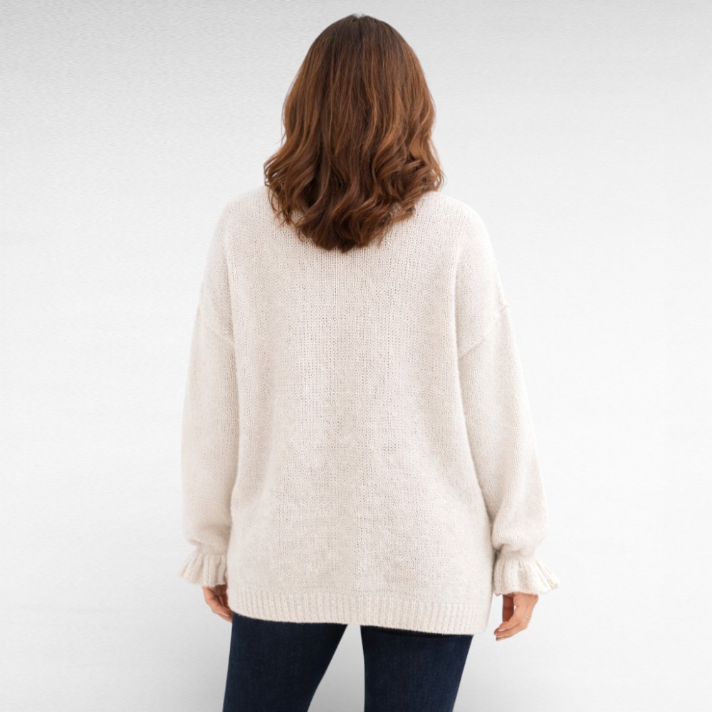 Kohevad pikad õlast pikendatud varrukad, mida otsas on armas sats, lisavad sviitrile naiselikku võlu ja modernset iseloomu, samal ajal kui klassikaline ümar kaelus hoiab üldmulje lihtsa ja ajatuna. See on rõivaese, mille poole sirutad käe ikka ja jälle.