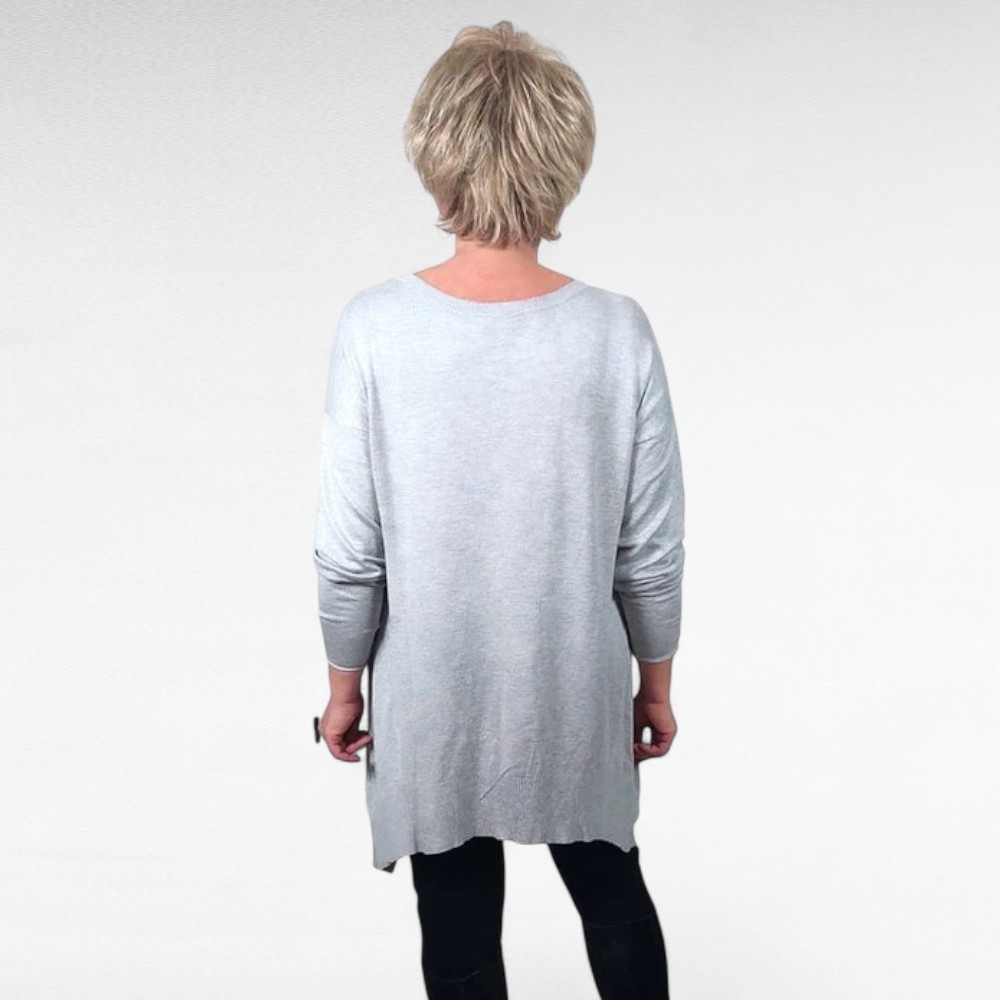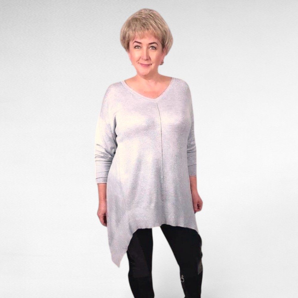 Pluss suurus helehall asümmeetrilise lõikega “Dorothy Perkins” firma tuunika/sviiter Inglismaalt. Õlaosa on pikendatud. Küljed on umbes 15cm pikemad kui eest ja tagant. Soojem materjal.