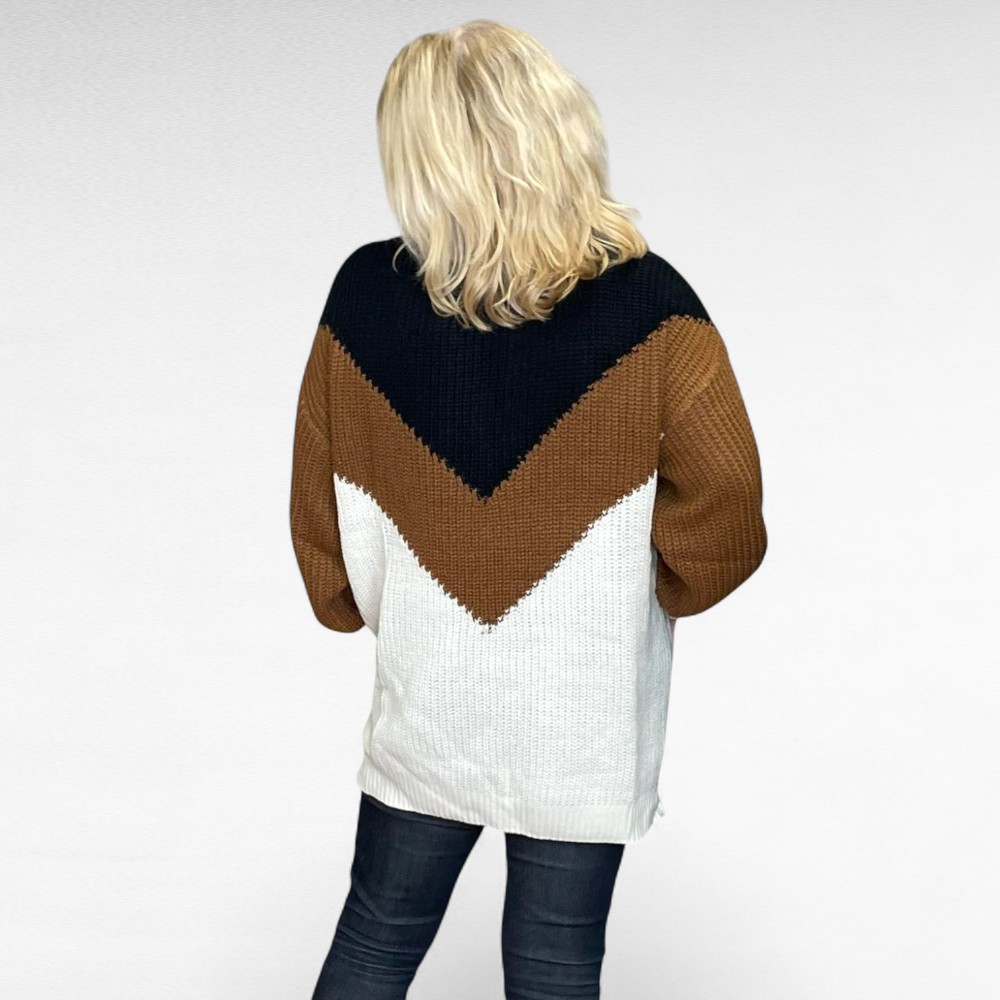 Musta-, valge-ja pruunikirju sakilise mustriga pikkade õlast pikendatud varrukatega õhem pikem sviiter. Kõrge kaelus, üleval pilkupüüdev suure rõngaga lukk.