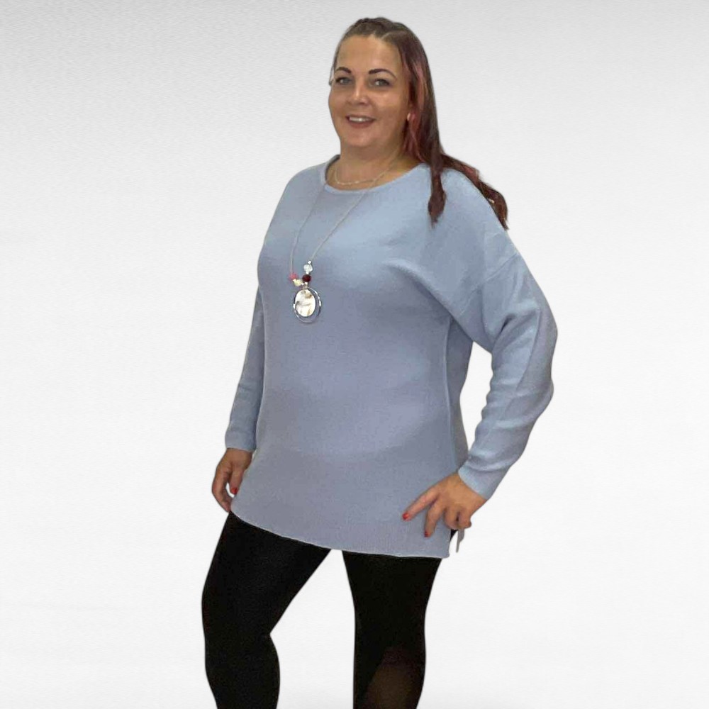 Helesinine pikkade varrukatega tekstuurse koemustriga sviiter Inglismaa firmalt “Damart”. Ei ole paks, sobib hästi siseruumis kandmiseks. Õlaosast pikendatud pikad varrukad. Varruka üldpikkus on mõõdetud kaelusest.