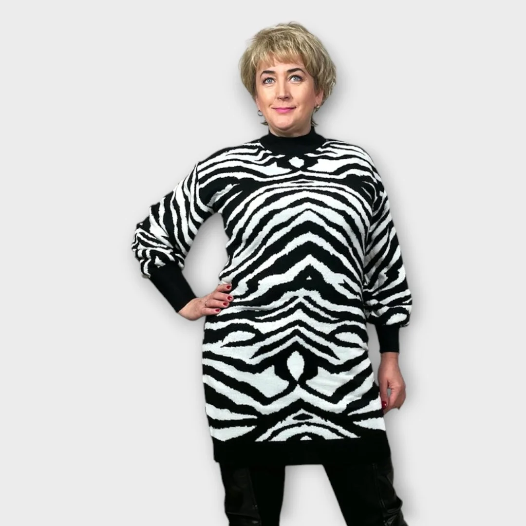 Kvaliteetne efektse musta- ja valgekirju sebramustriga kinnise kaeluseosaga pikk sviiter Inglismaa firmalt “Brave Soul”. Õlaosa on veidi pikendatud, varrukad on avarad. Varruka otsad, altäär ja kaeluse äär on mustas soonikkoes.