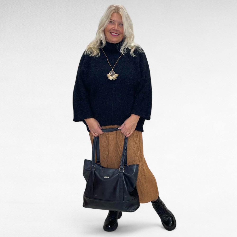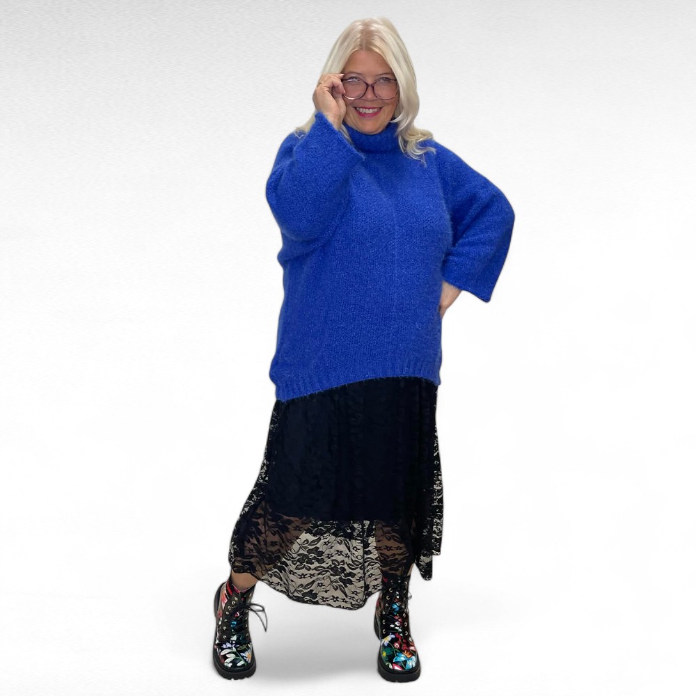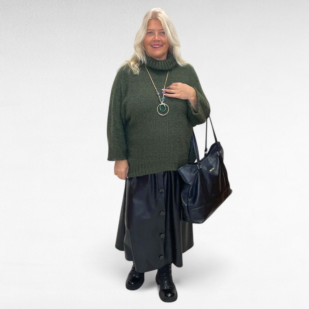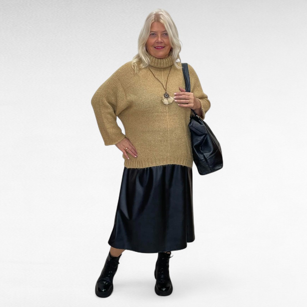 Mõnus soe ja pehme kõrge kaelusega kolmveerandpikkusega avarate varrukatega sviiter “Belly”. Tagant on veidi pikem kui eest. Sobib lühemale kasvule-160cm