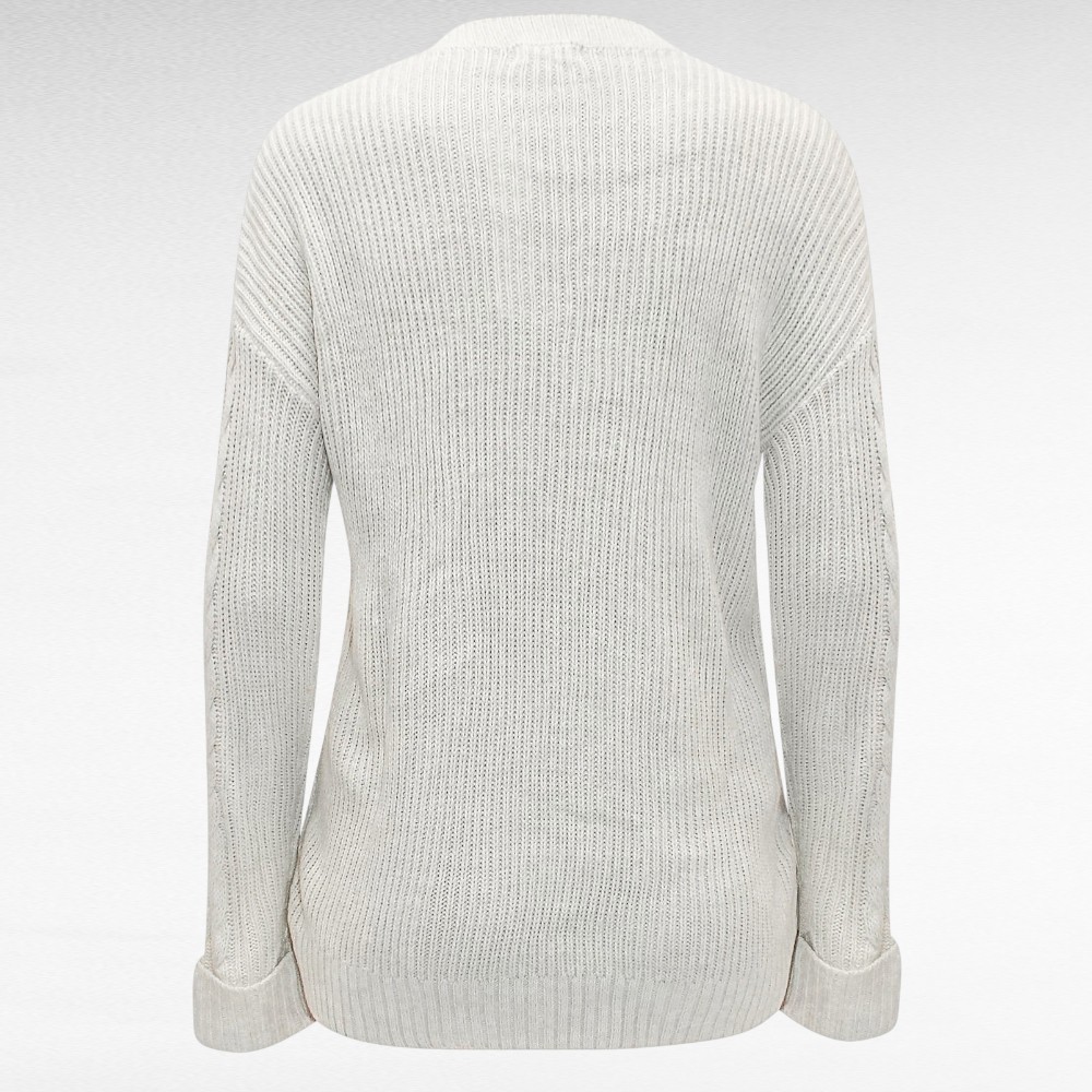 Pluss suurus termoakrüülist pehme ja soe ivoryvalge palmikkoes sviiter naistele Inglismaalt firmalt “Damart”. Ümar kaelus, pikendatud õlaosaga pikad varrukad. Õla peal ja varrukatel dekoratiivsed tumedad nööbid.