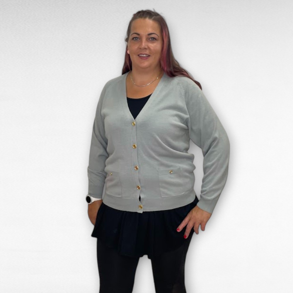 Pehme õhem eest kuldsete nööpidega hall lühem kardigan Inglismaalt firmalt “Marisota”. Külgedel taskud.