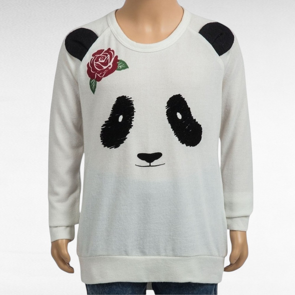 Valge pikkade varrukatega pandapildiga pehme sviiter tüdrukutele.  Inglismaa firma “Belle du Jour”. Kõrvad on nagu päris, hoiavad sviitrist eemale 🙂 Tagant on üleni valge.