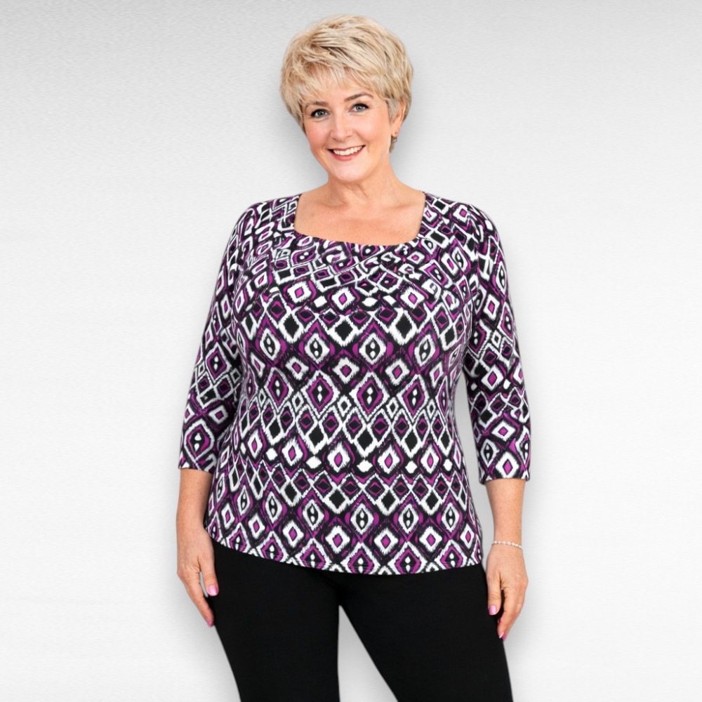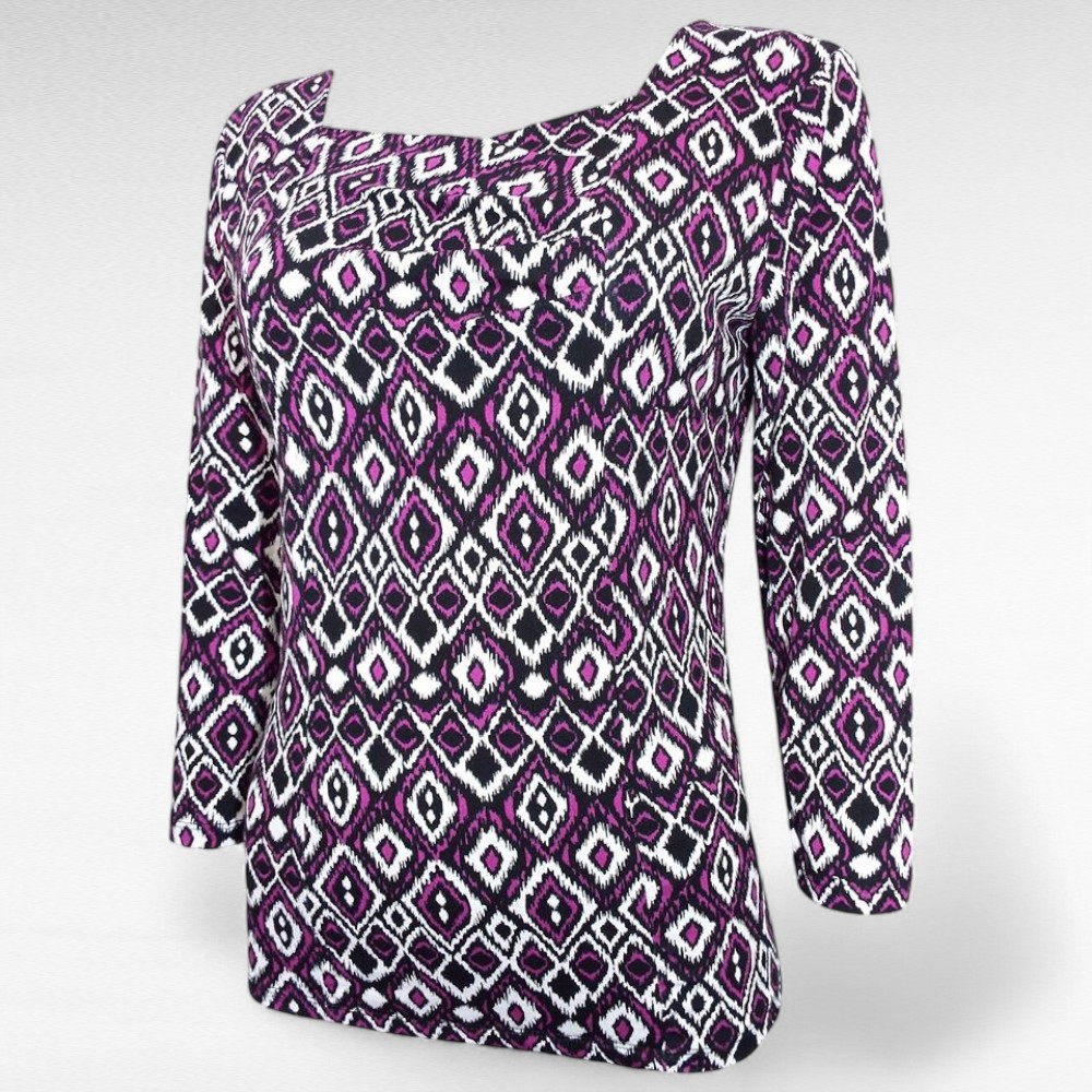 Lilla-, valge-ja mustakirju rombimustriga venivast stetchikast viskoosmaterjalist poolpikkade varrukatega igapäevane pluus Inglismaalt firmalt “Zuri”. Hea pikkus, sobib nii seeliku kui pükstega. Kaunis naiselik nelinurkne kaeluseosa. Ei kortsu, supermõnus materjal.