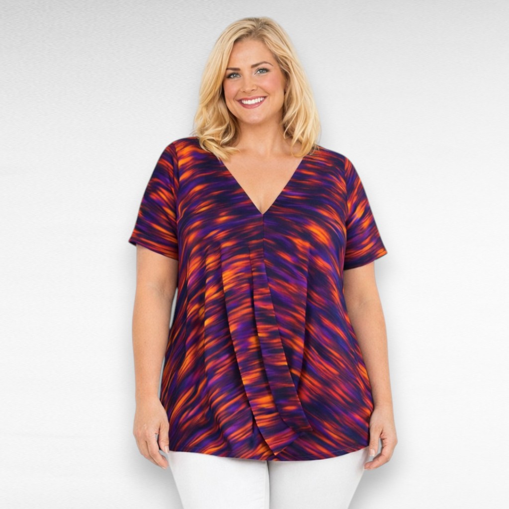 Kaunis tuleleegitoonides lilla-ja oranzikaskollase mustriga V-kaelusega lühikeste varrukatega hõlmiklõikega extra pluss suuruses tuunika Inglismaalt firmalt “Evans”. Tagant on umbes 7cm pikemad kui eest, altäär on kaarjas. Külgedel väikesed lõhikud.