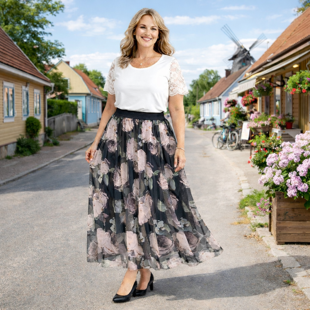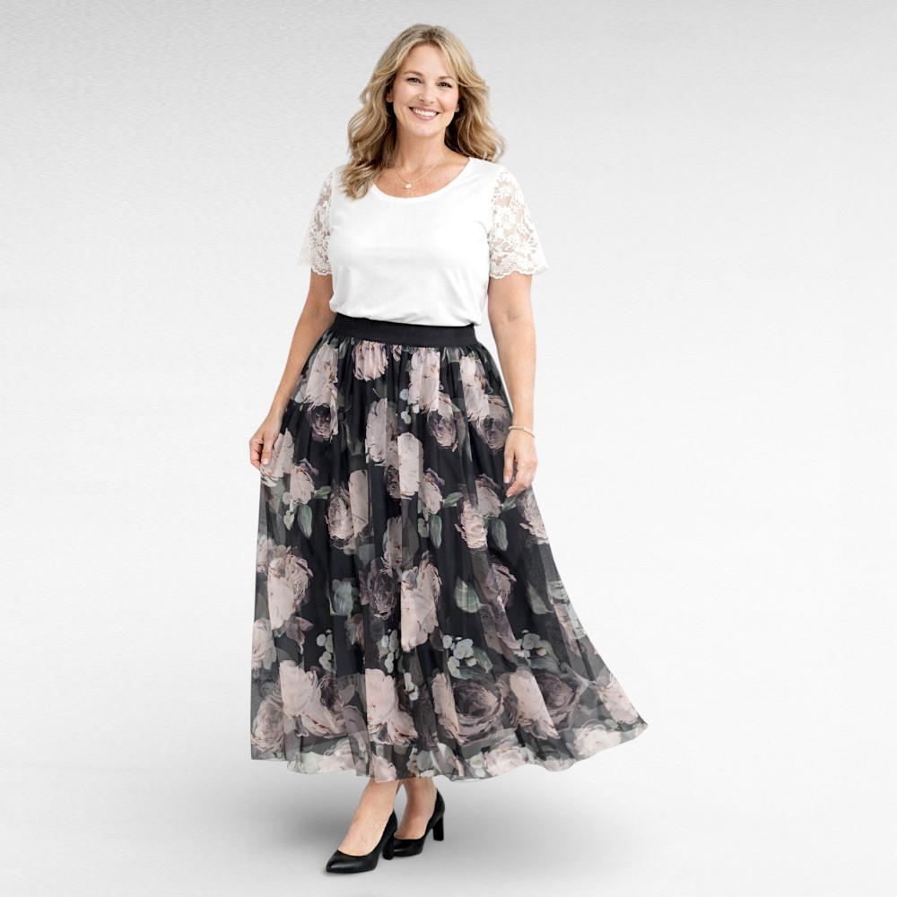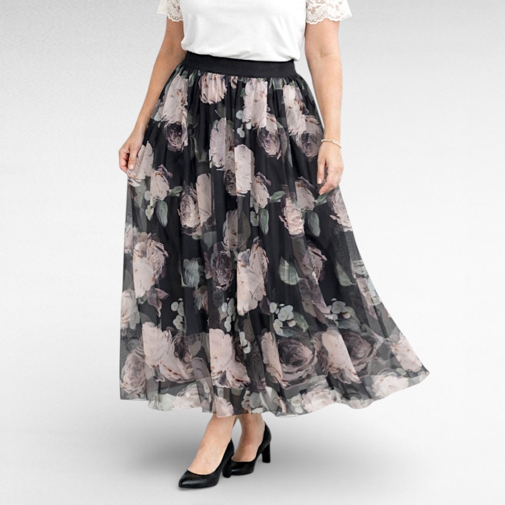 Kolmekihiline tegumood annab seelikule sügavuse ja luksusliku langevuse. All on must siidjas vooder, mis tundub naha vastas mõnus ja tagab enesekindla kandmismugavuse. Vahekihiks on must võrgulaadne šifoon, mis lisab kohevust ja kaunist liikuvust. Pealmine kiht on imeliselt kauni lillemustriga šifoonkangast – õhuline, kerge ja elegantselt läbikumav, tuues mustri eriti kaunilt esile.