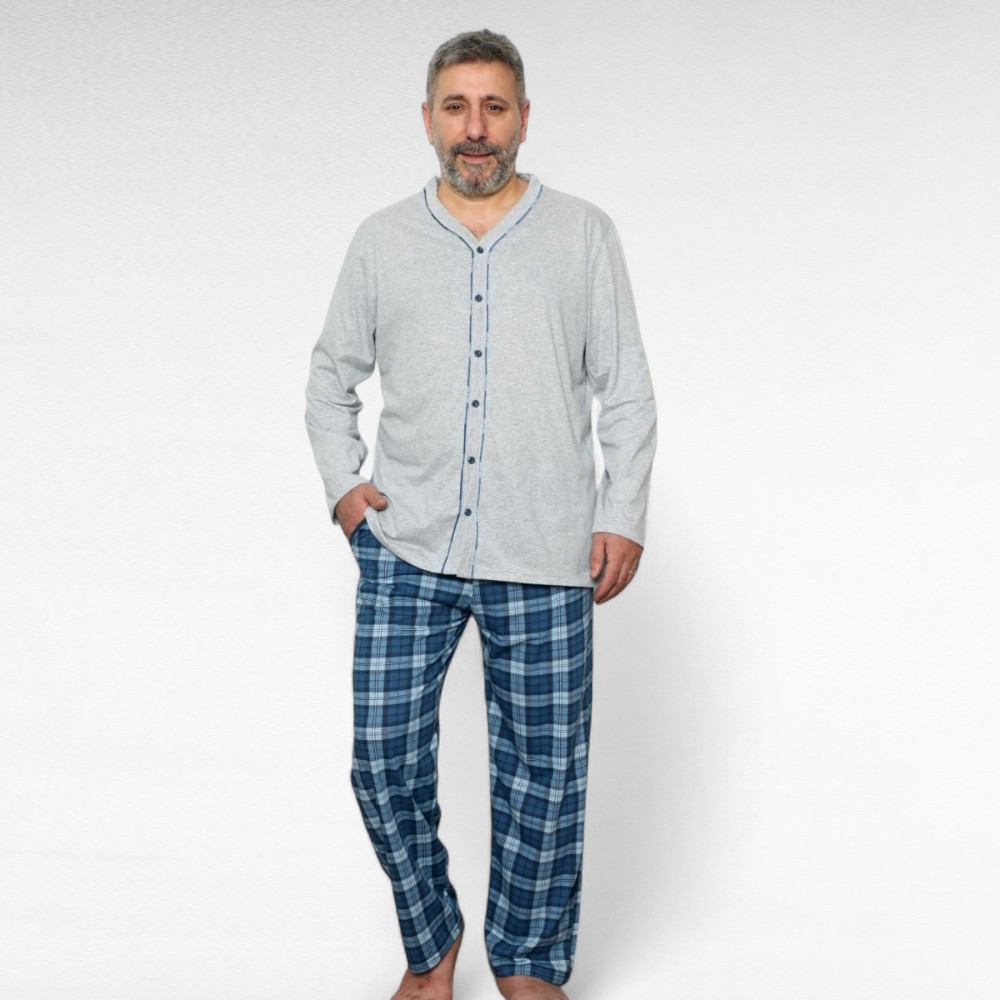 Mugav puuvillane pikkade ruuduliste pükste ja halli pikkade varrukatega pluusiga pidžaama meestele. Pükstel on isegi taskud, vöökoht on kummiga. Mõõdud on antud vabalt, et kehal oleks ruumi hingata.