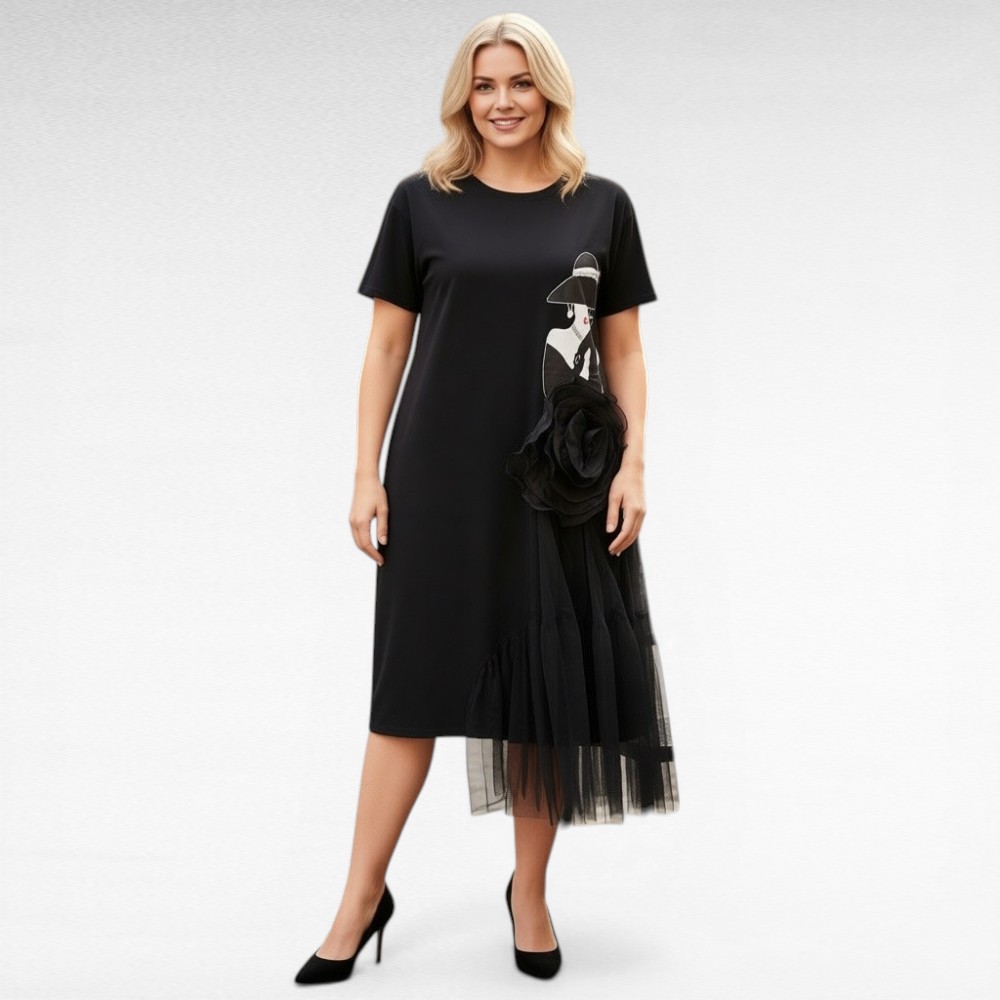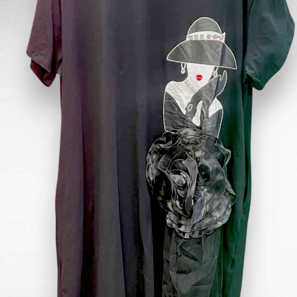 See Itaalia firma “Fly Out” must kleit ühendab endas mugavuse ja kunstilise disaini. Pehme langev kangas paitab keha, samas kui pilkupüüdev naise näoga graafiline muster, lisab luksusliku ja erilise puudutuse. Efektne tüllidetail ja dekoratiivne lill loovad unikaalse, kergelt mängulise, kuid samas elegantse terviku. Näomustril kaunistuseks sätendavad kivikesed.