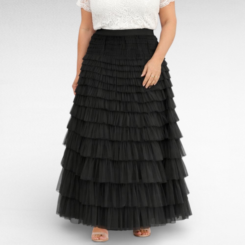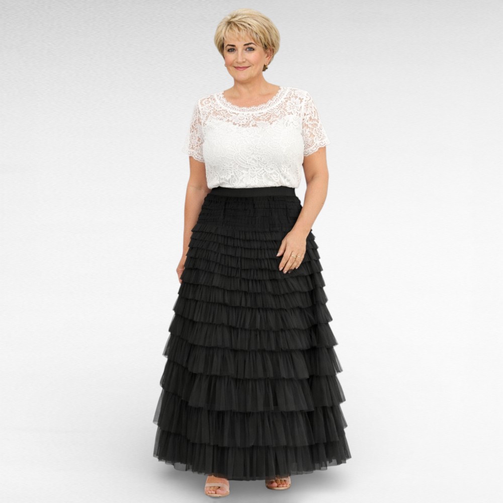 Kaunis ja naiselik tüllkangast satsiline alt voodriga pluss suuruses maksiseelik “Maria”. Vöökoht on veniva kummiga. Lõige on alt veidi laienev, vabaltlangev, materjal ei kortsu. Kerge ja õhuline kangas.