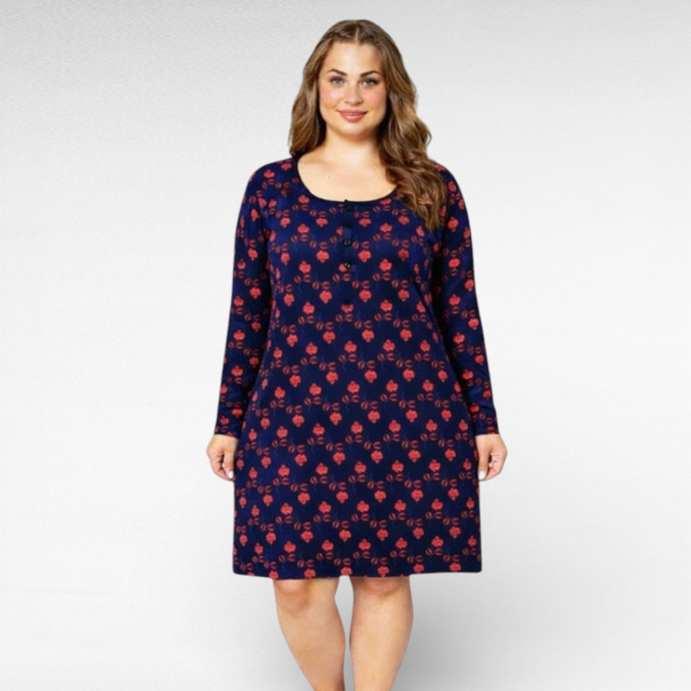 Mõnusad pehmed pikkade varrukatega tumesinised erksa punase lillemustriga puuvillased öösärgid firmalt “La Penna”. Pikkus jääb veidi üle põlve. Kaeluse ääres üleval väike nööbirida.