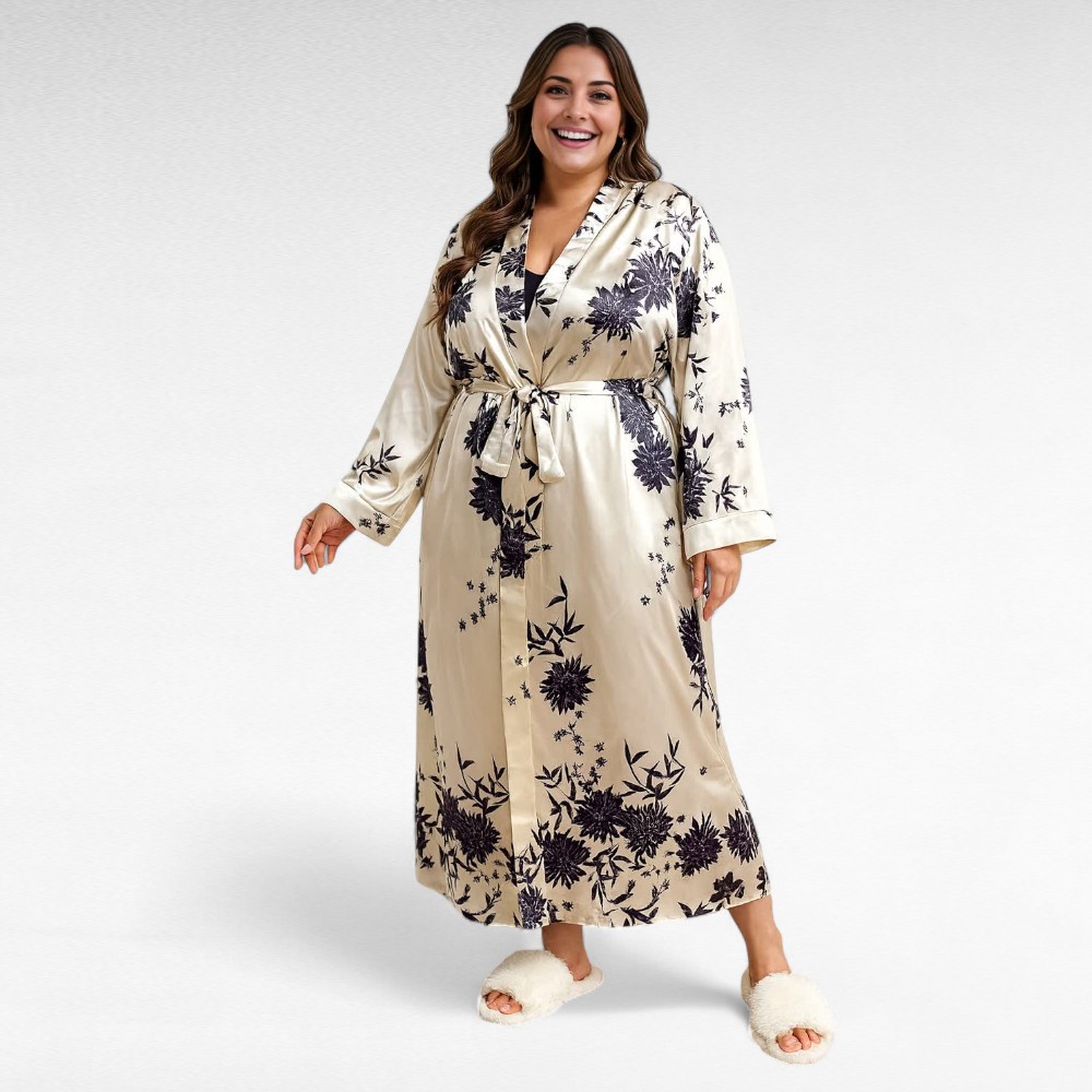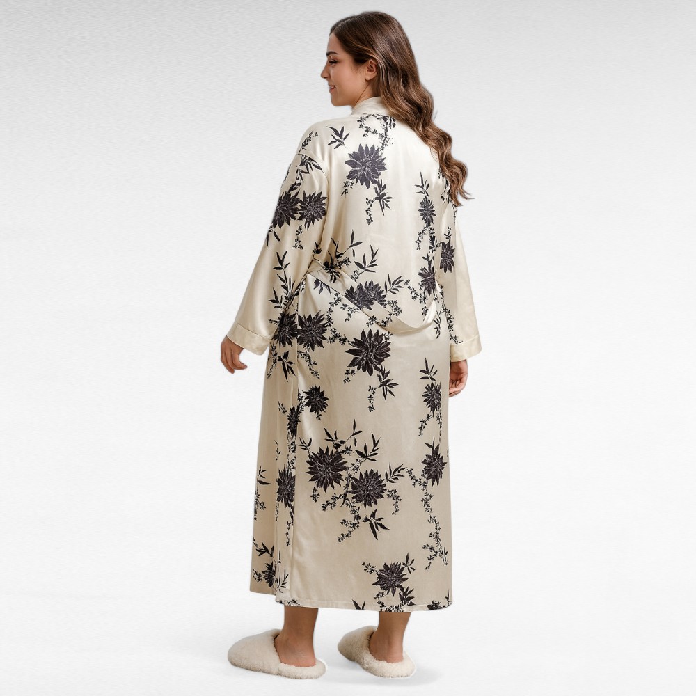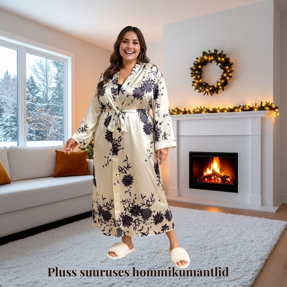 Naudi iga kodust hetke kui väikest rituaali… “Elisee” on rohkem kui lihtsalt hommikumantel-see on hetk iseendale. Kreemikasvalge pluss suuruses siidjalt läikiv satiin, mida kaunistab suur ja efektne tume lillemuster, loob naiseliku, elegantse ja tõeliselt luksusliku terviku. Mantel langeb kaunilt maani, varrukad on avarad ning vöö toob esile su figuuri kõige ilusamad jooned.
