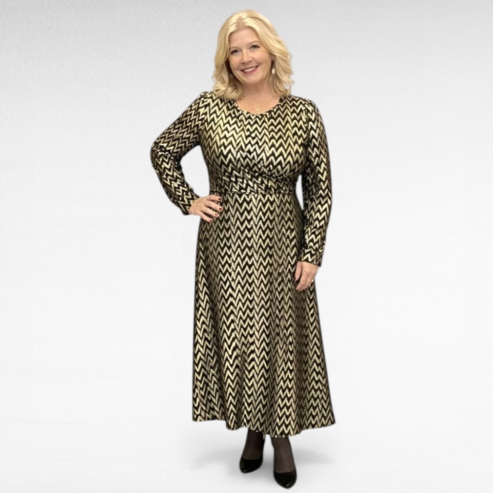 Väga kaunis ja luksuslik kuldne musta sakilise mustriga rinnaosast kahekordse langeva hõlmiklõikega keskelt taljes ja alt veidi laienev pikkade varrukatega pikk kleit “Samantha”. Materjal on veniv, ei kortsu, langeb hästi, läbi ei paista.