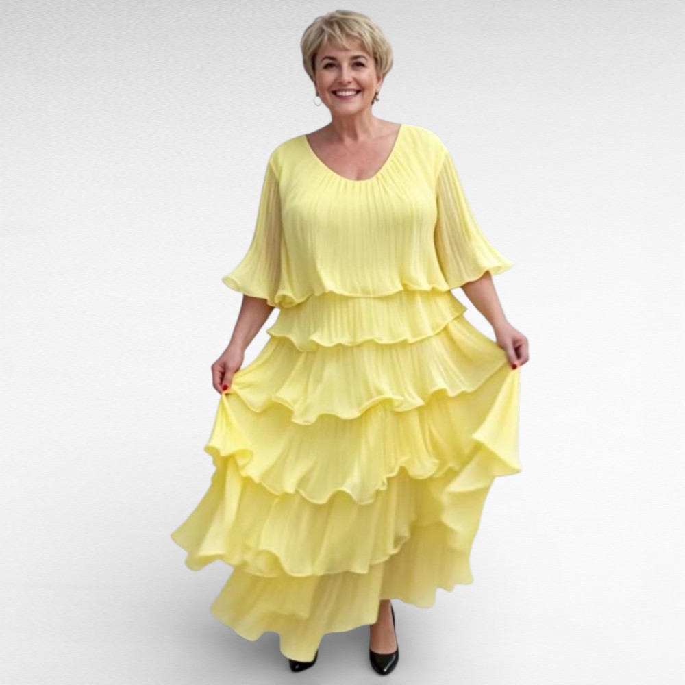 See kaunis ja pilkupüüdev pikk kleit on loodud naisele, kes armastab tunda end erilisena. Õrnalt langev luksuslik plisseerkangas ning romantilised kihilised satsid loovad liikuva ja voogava silueti, mis muudab iga sammu elegantseks ja naiselikuks.