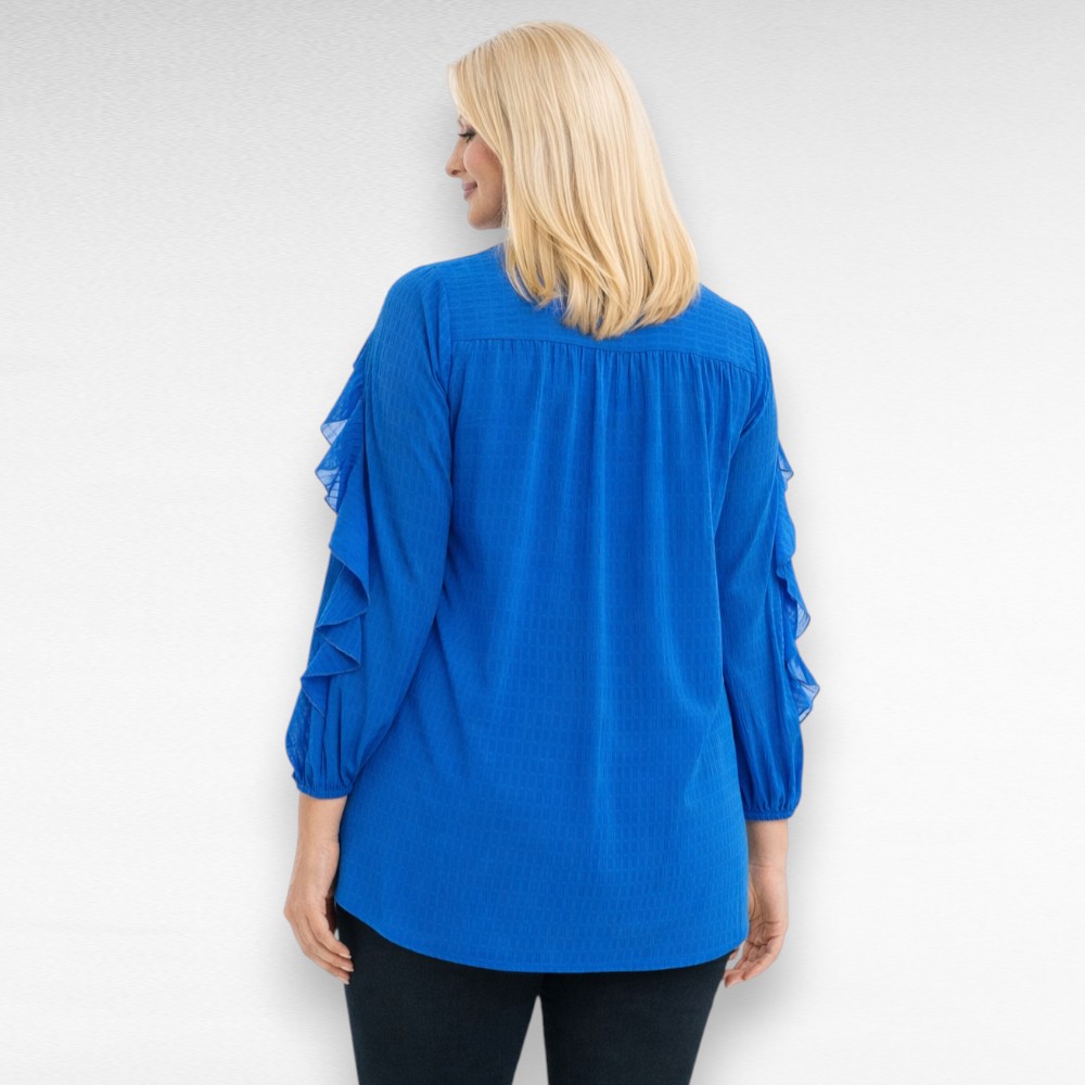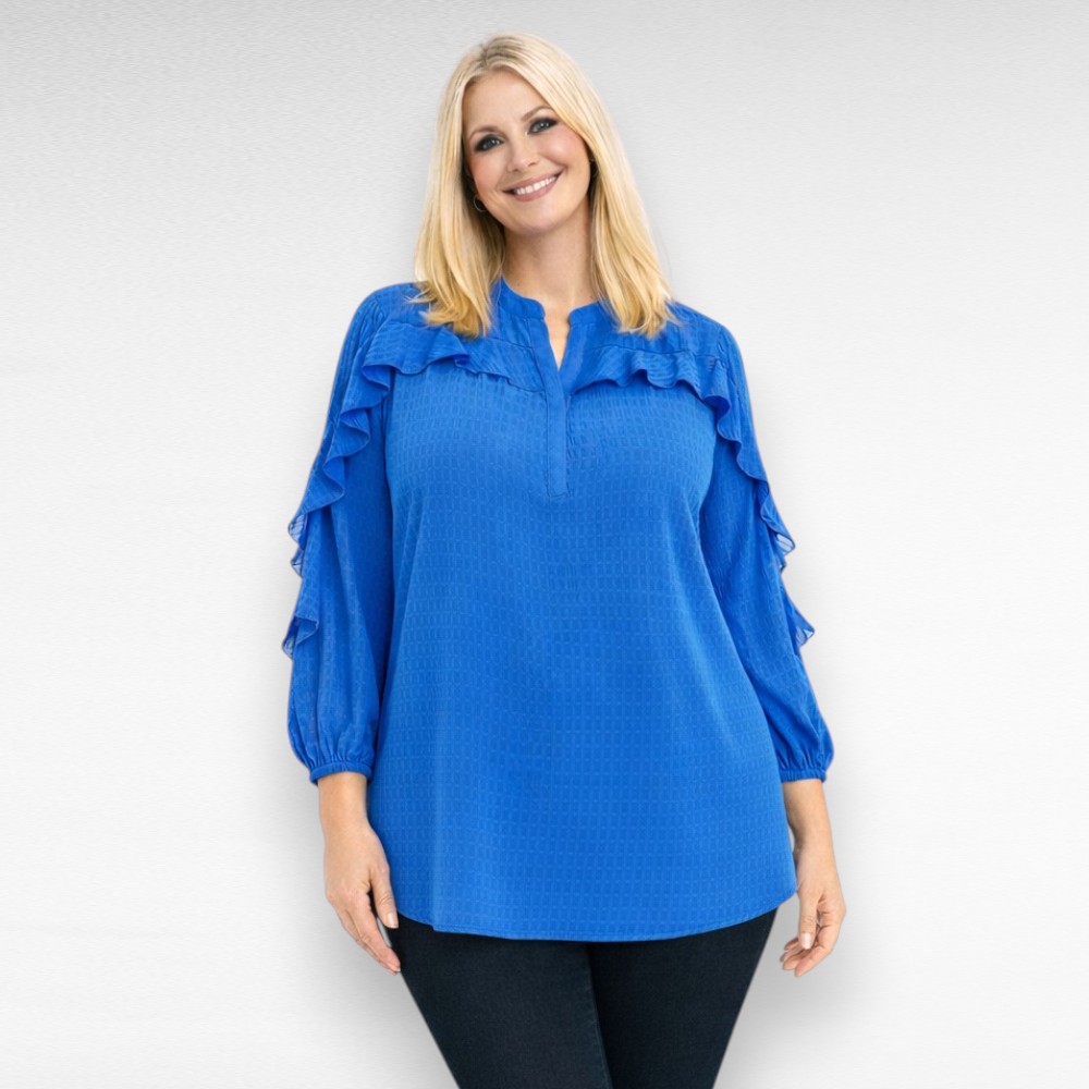 Väga kaunis ja naiselik V-kaelusega erksinine volangidega kaunistatud pikkade varrukatega pidulik pluss suurus naiste pluus Inglismaalt firmalt “JD Williams”. Siidjas materjal, sirge lõige.