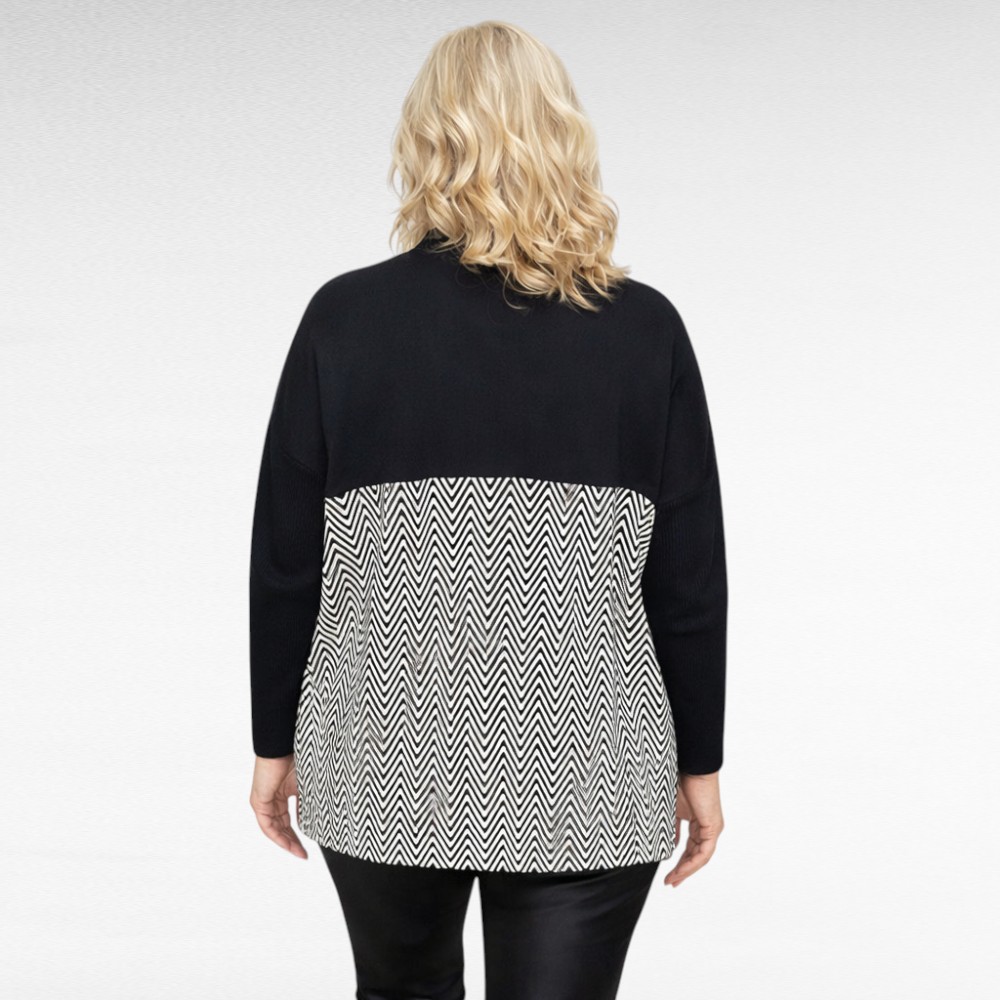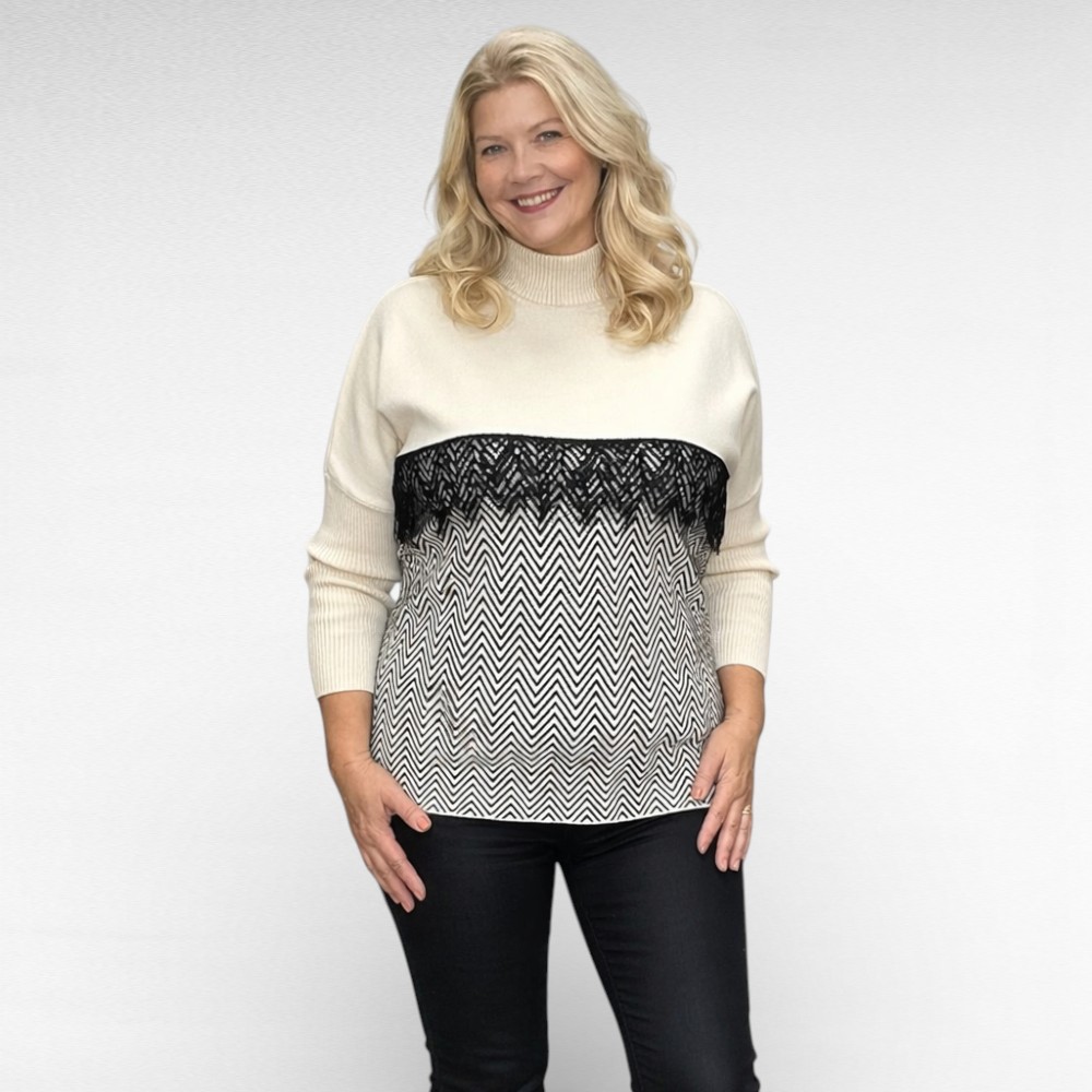 Naiselik sakilise mustriga rinna pealt musta pitsiga kõrgema kaelusega avara lõikega lühem sviiter “Tiivi”. Kimonolõikega, varrukad on soonikkoes. Sobib nii seeliku kui pükstega.