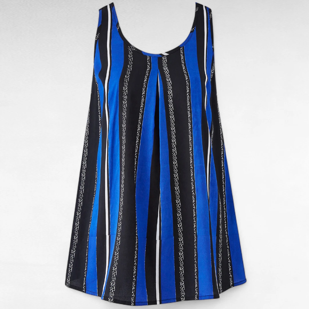 Pilkupüüdva musta-, valge-ja sinisetriibulise mustriga siidjas top Inglismaalt firmalt “Anthology”. Sobib kanda suvel topina ja aastaringselt ühevärvilise pintsaku all pluusina.