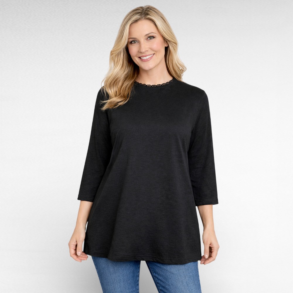 Must pehmest puuvillasest kangast armsa kinnise pitskaelusega poolpikkade varrukatega pikem pluus Inglismaalt firmalt “Sheego”. Selja taga üleval pisike hõbedane ümmargune metallmärk “Sheego” logoga.