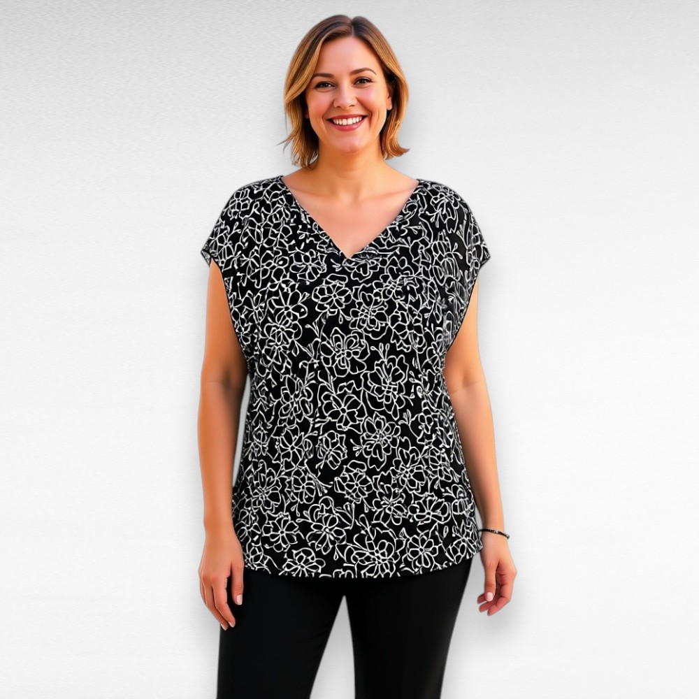 Šifoonmaterjalist musta- ja valgekirju raglaanlõikega pluus Inglismaalt firmalt “Blancheporte”. Rinnaosa on avar, allääres seotav pael. Väike õlapealejääv varrukaosa. Tegemist on õhema pluusiga, kumab läbi. Soovi korral võib topi alla panna aga midagi väga hullu ka pole, võib ka ilma topita kanda. Sobib nii seeliku kui pükstega.