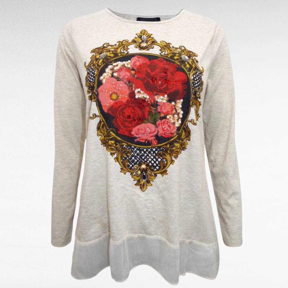 Beež eest kauni suure erksavärvilise barokkstiilis mustriga, kivikeste ja pärlitega kaunistatud pikem pluus/tuunika Inglismaalt firmalt “Style and Co”. All õhuke sats, tagant pikem kui eest. Sobib hästi teksade või retuusidega. Tegumood on alt pisut laienev. Tagant on üleni beež.