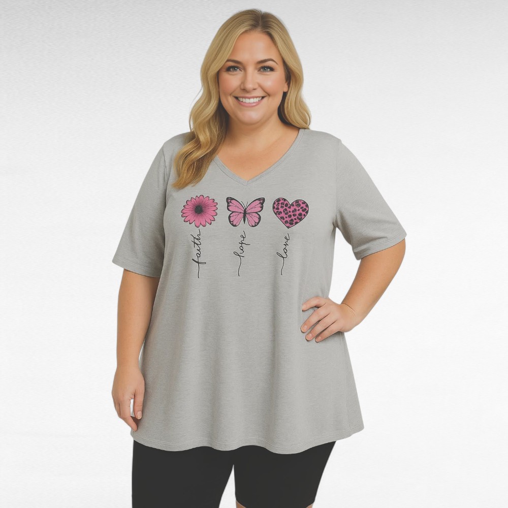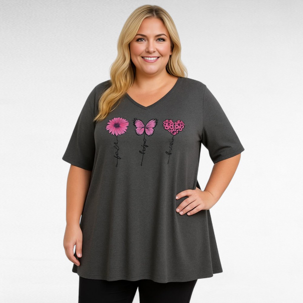 Puuvillane V-kaelusega rinna pealt südame-, liblika-ja lillemustriga sirge lõikega lühikeste varrukatega pluus firmalt “Betti Fashion”. Hea materjal, venib veidi ja ei kortsu.