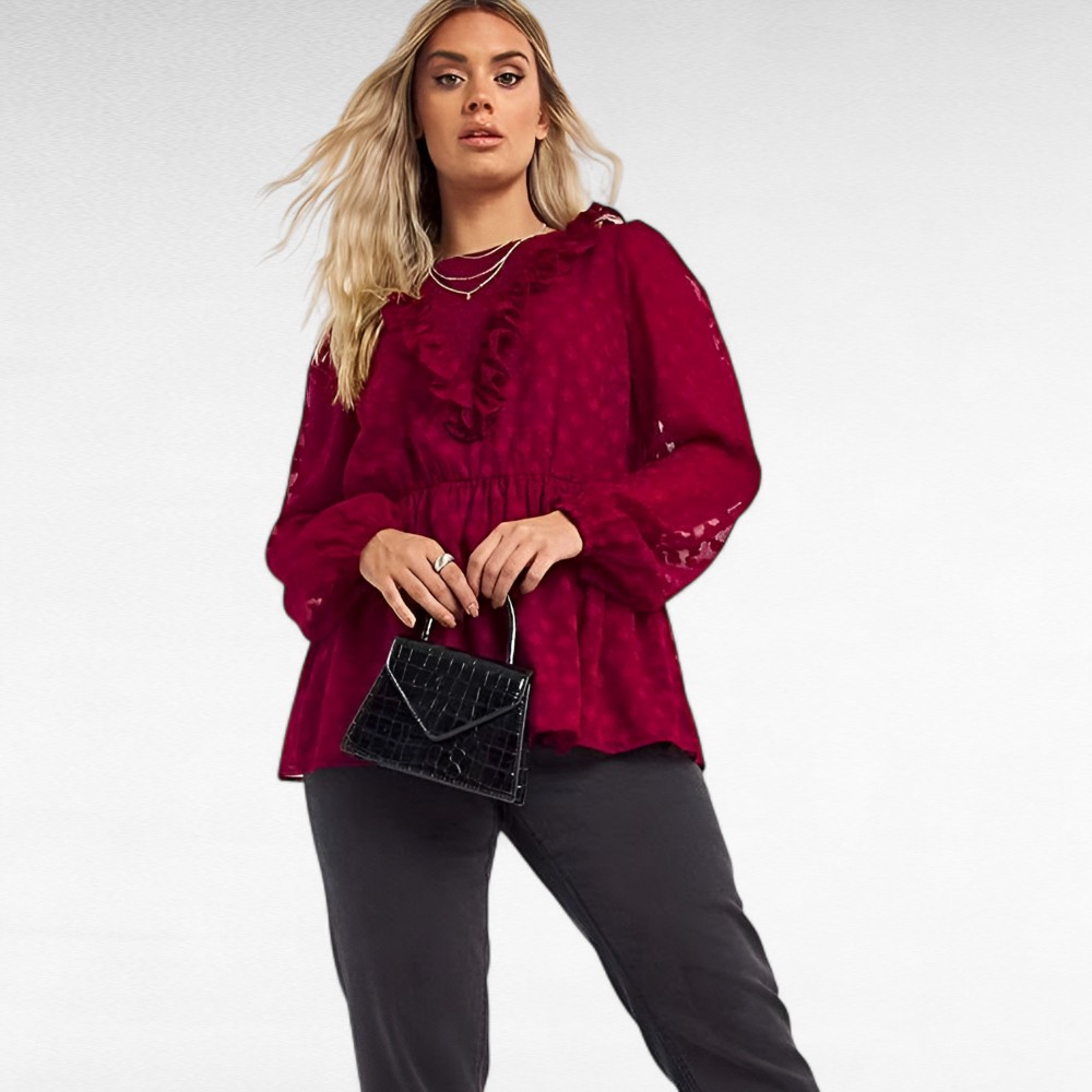 Imekaunis romantilises stiilis veinipunane eest suure kolmnurkse satsiga, keskelt taljes peplumlõikega säbrulise mustriga pidulik pluus/tuunika Inglismaalt firmalt “Simply Be”. Pluus on alt voodriga. Õhulised avarad otsast kummiga varrukad. Selja taga peenikesed kummid.