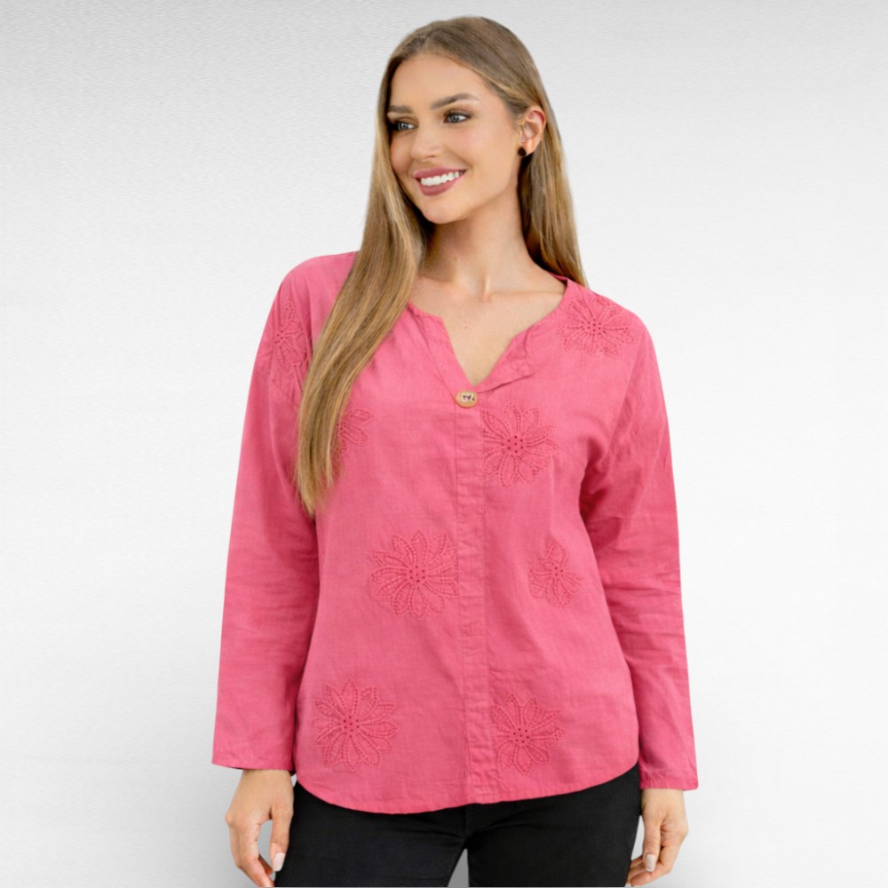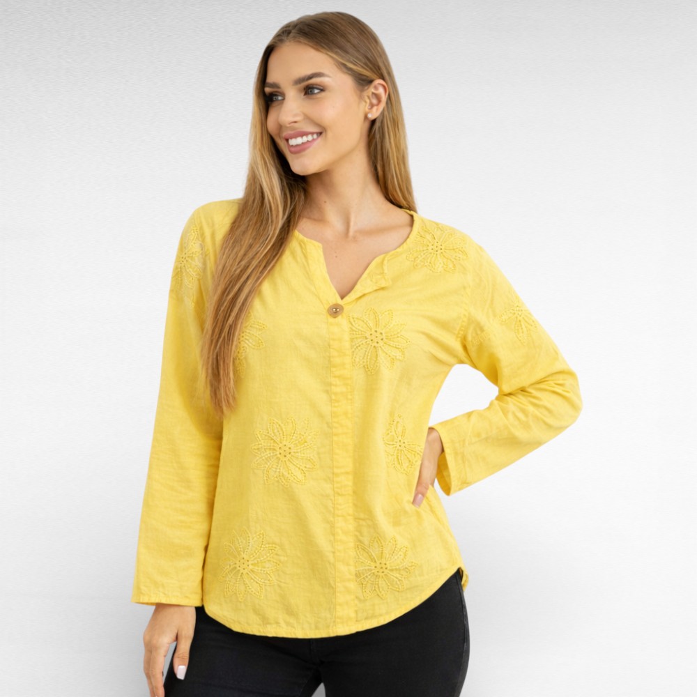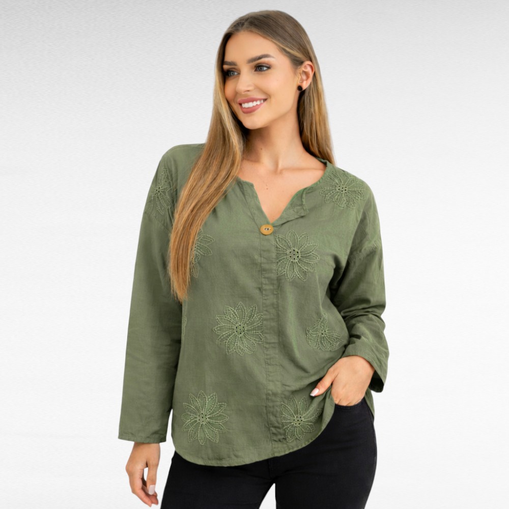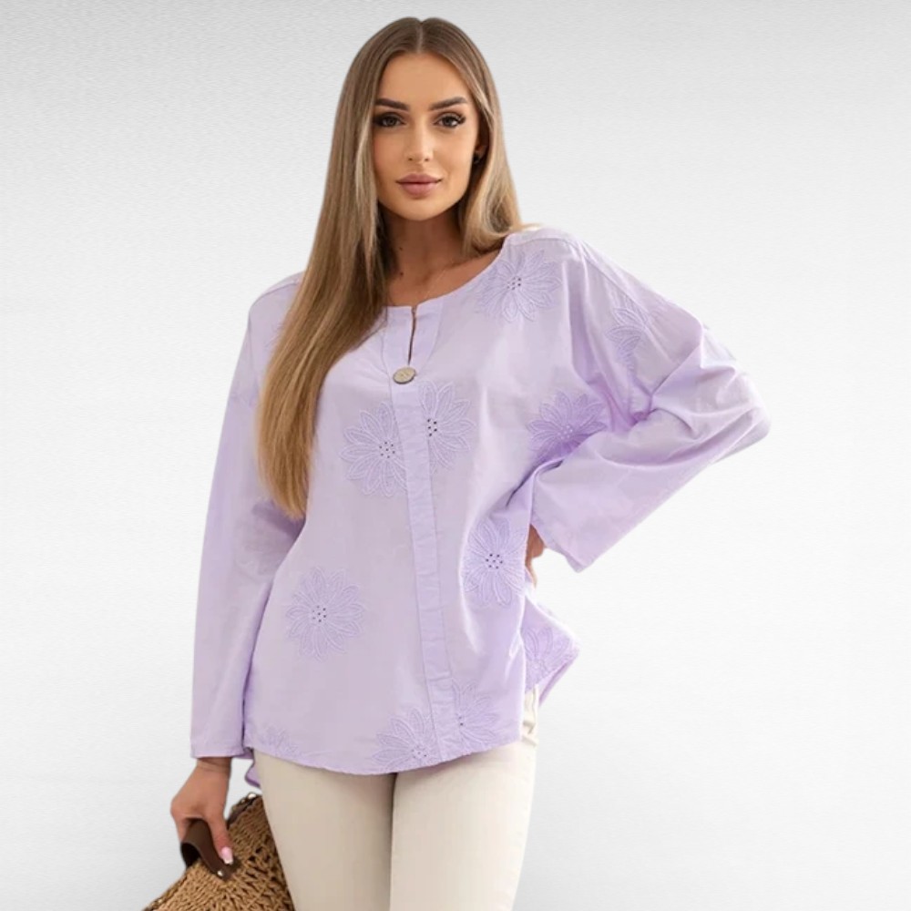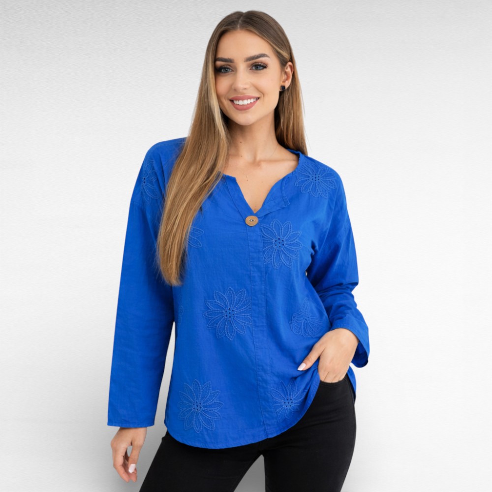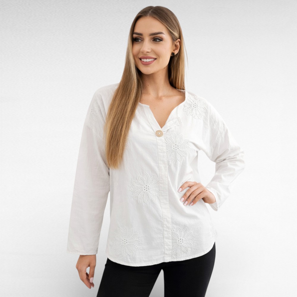 Naiselik õhemast puuvillasest kangast ülevalt 1 nööbiga kauni sissepressitud broderiipitsist lillemustriga pikkade varrukatega sirge lõikega pluus “Marietta”. Tagant kaarjas ja pisut pikem. Sobib kanda aastaringselt nii igapäevaselt kui ka pidulikul puhul.