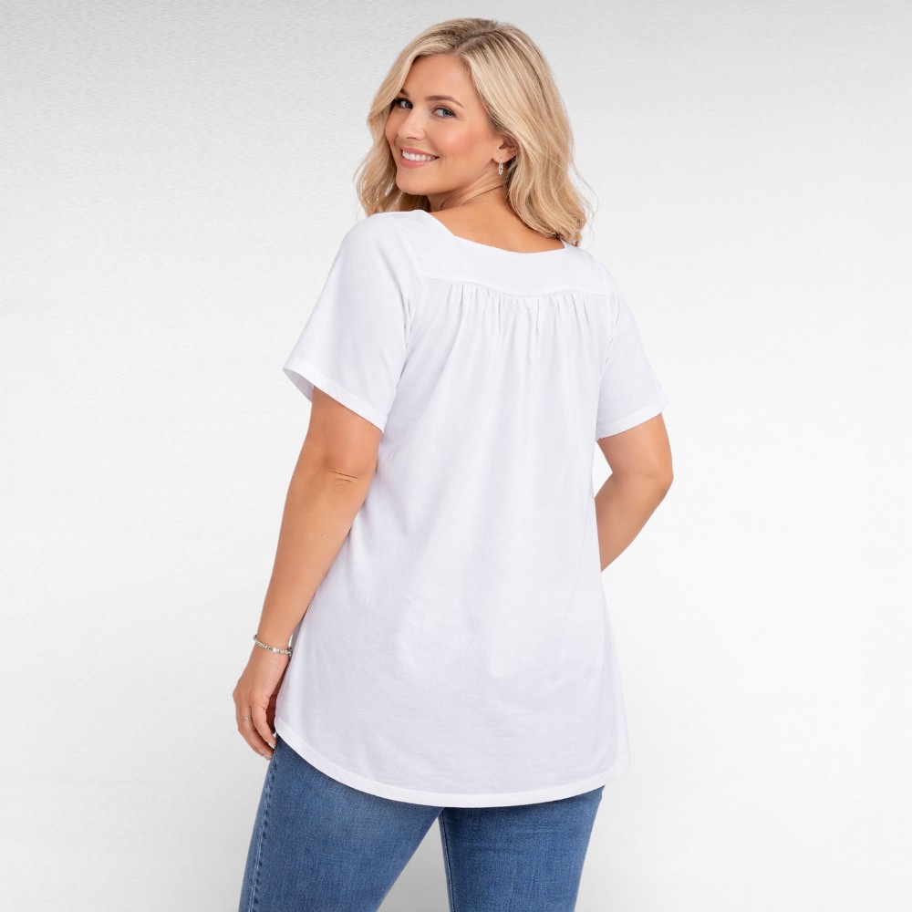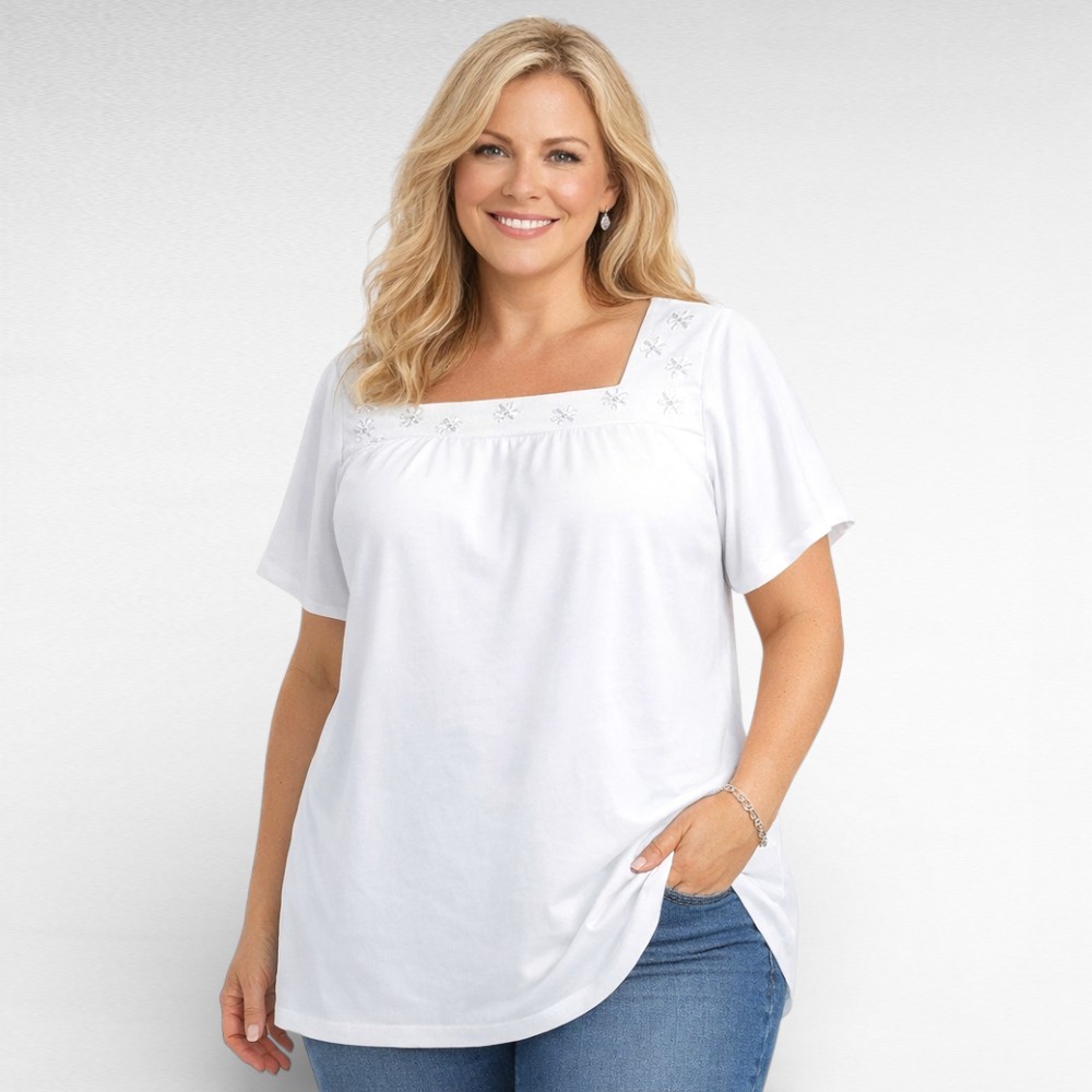 Valged nelinurkse lilletikanditega ehitud kaelusega lühikeste varrukatega alt laieneva lõikega pikemad pluss suuruses pluusid/tuunikad Inglismaalt firmalt “Lane Bryant”. Paksem pehme veniv trikotaažilaadne kangas.
