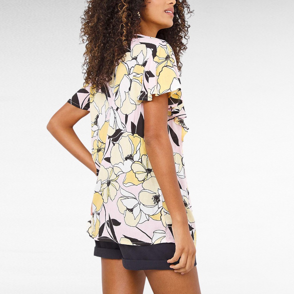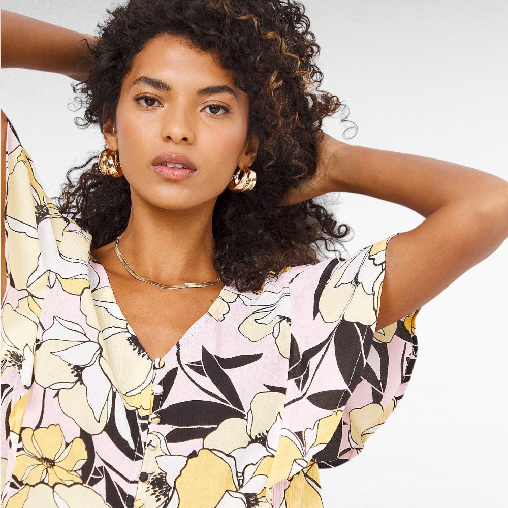 Kaunis naiselik kollase-, roosa-, valge- ja mustakirju mustriga avara lõikega lühikeste varrukatega kortsuriidest pluus Inglismaalt firmalt “JD Williams”. Naiselik V-kaelus, ees nööbid.