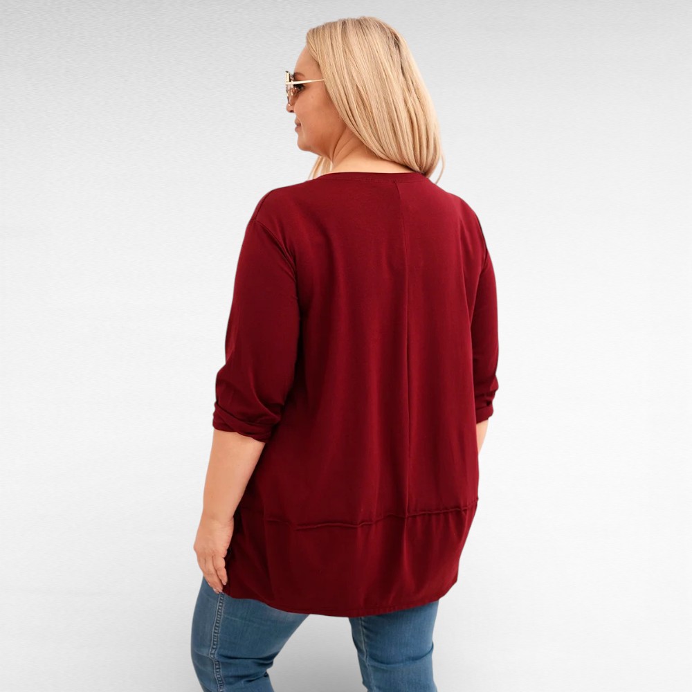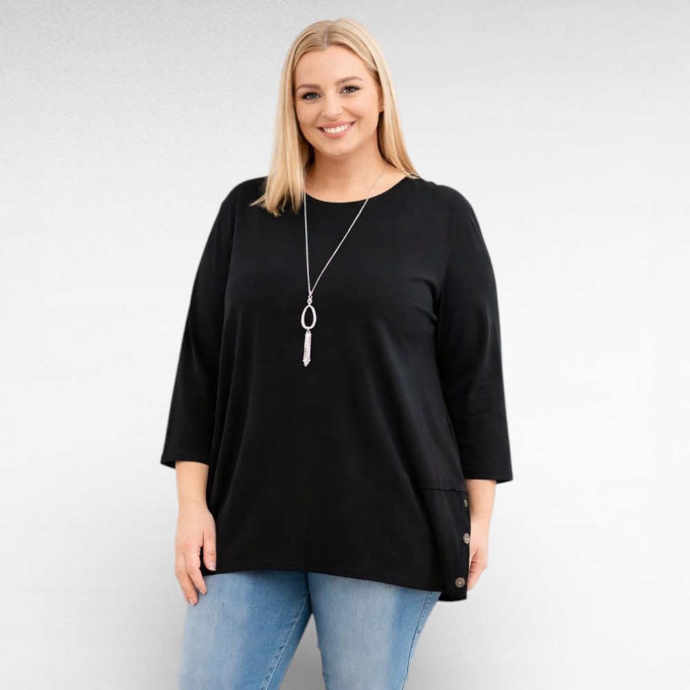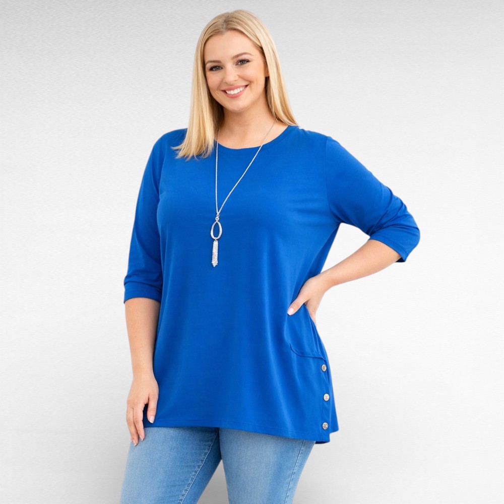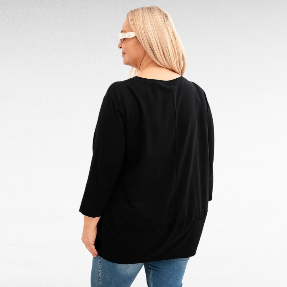 See pluss-suuruses pluus Itaalia firmalt “New Collection” on mõeldud naisele, kes soovib end tunda vabalt ja kindlalt kogu päeva vältel. Puuvillasegune kangas puudutab nahka pehmelt ja laseb kehal hingata, samal ajal kui elastne, veidi avaram lõige järgib keha loomulikku liikumist ning sobib suurustele 50–52. Külgedel paiknevad dekoratiivsed nööbid toovad riietusse isikupära ning üleskeeratavad kolmveerandpikkusega varrukad annavad võimaluse muuta välimust vastavalt tujule.