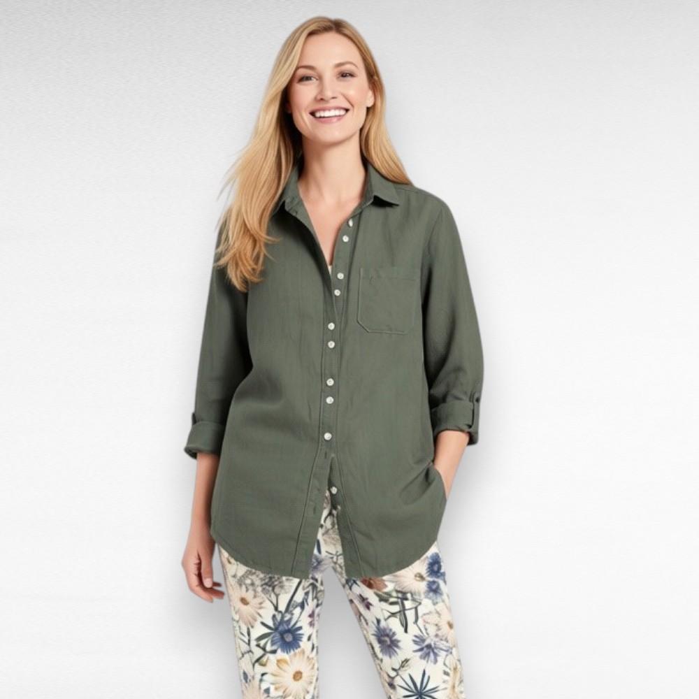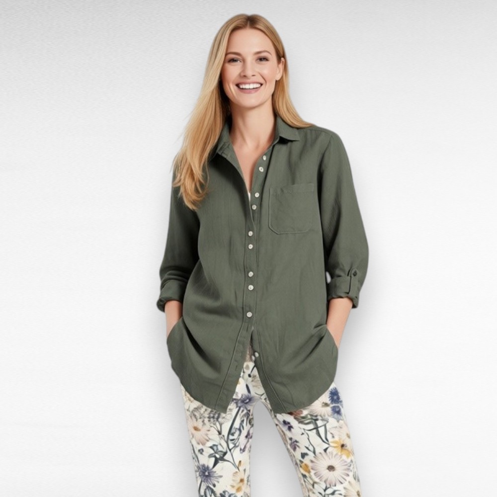 Värskendage oma garderoobi linasegusest materjalist eest nööpidega pikkade varrukatega stiilse khakirohelise pluusiga Inglismaalt firmalt “Rick Cardona”. Varrukad saab nööbikinnitusega lühemaks teha. Rinnal tasku.