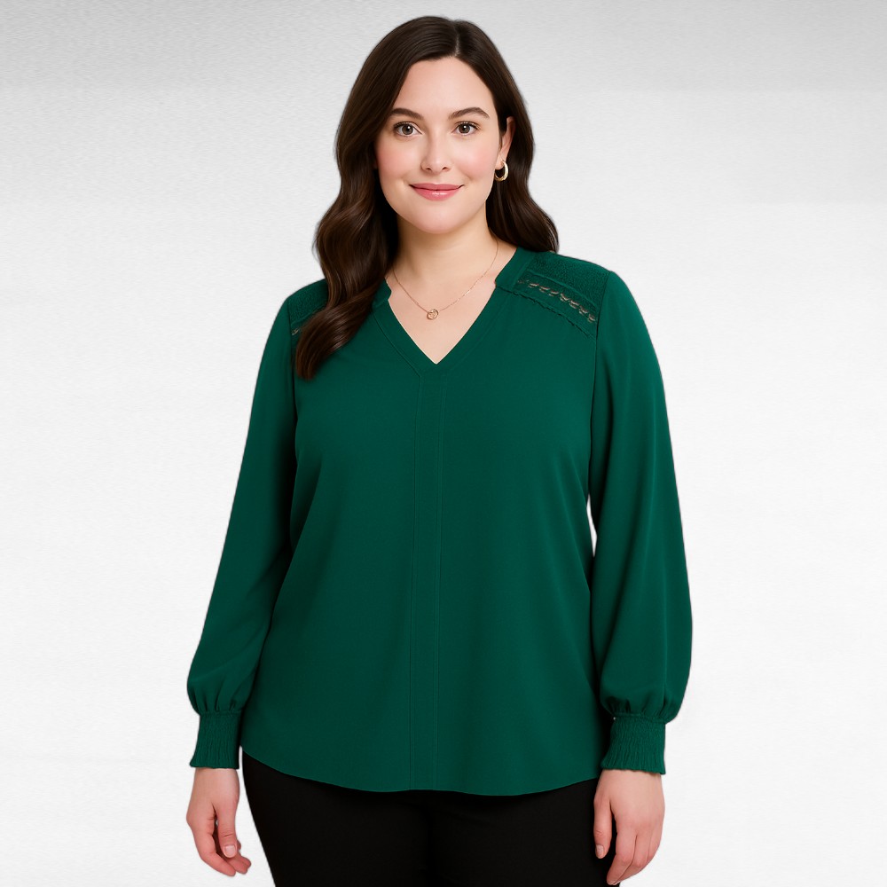 Väga kaunis tealtooni veidi kortsutatud riidest pikkade õlast kroogitud avarate varrukatega V-kaelusega pluus Inglismaalt firmalt “Julipa”. Varruka otstes on peenikesed kummid. Kaeluse ääres väike püstine pitsist äär, õla pealt pilutatud pitsiga kaunistused. Rinnaosas ees 1 peidetud pikivolt.