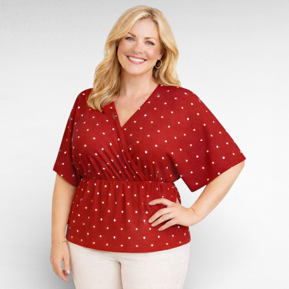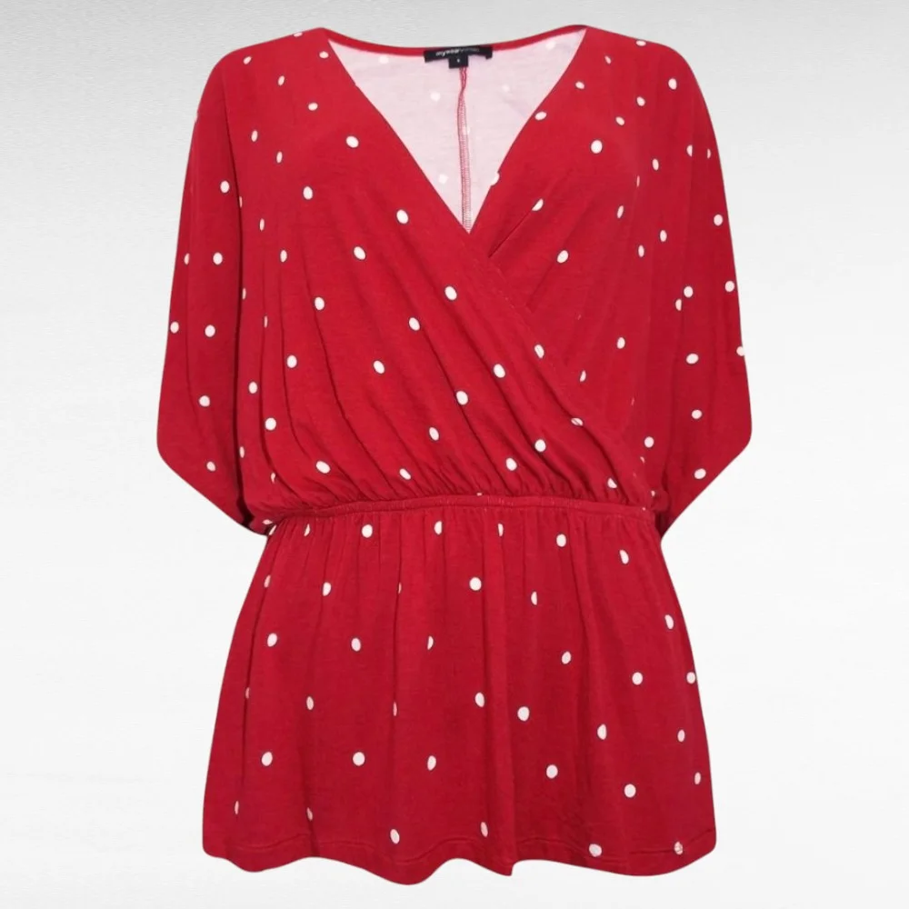 Pehmest venivast hingavast materjalist tumepunane valgemummulise mustriga hõlmiklõikelise V-kaelusega keskelt kummiga õlale langeva varrukaosaga pluus Inglismaalt firmalt “My Wear Woman”. Sobivad nii seeliku kui pükstega. Vöökoht jääb õige koha peale.