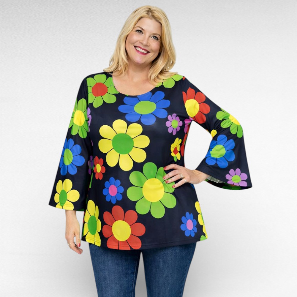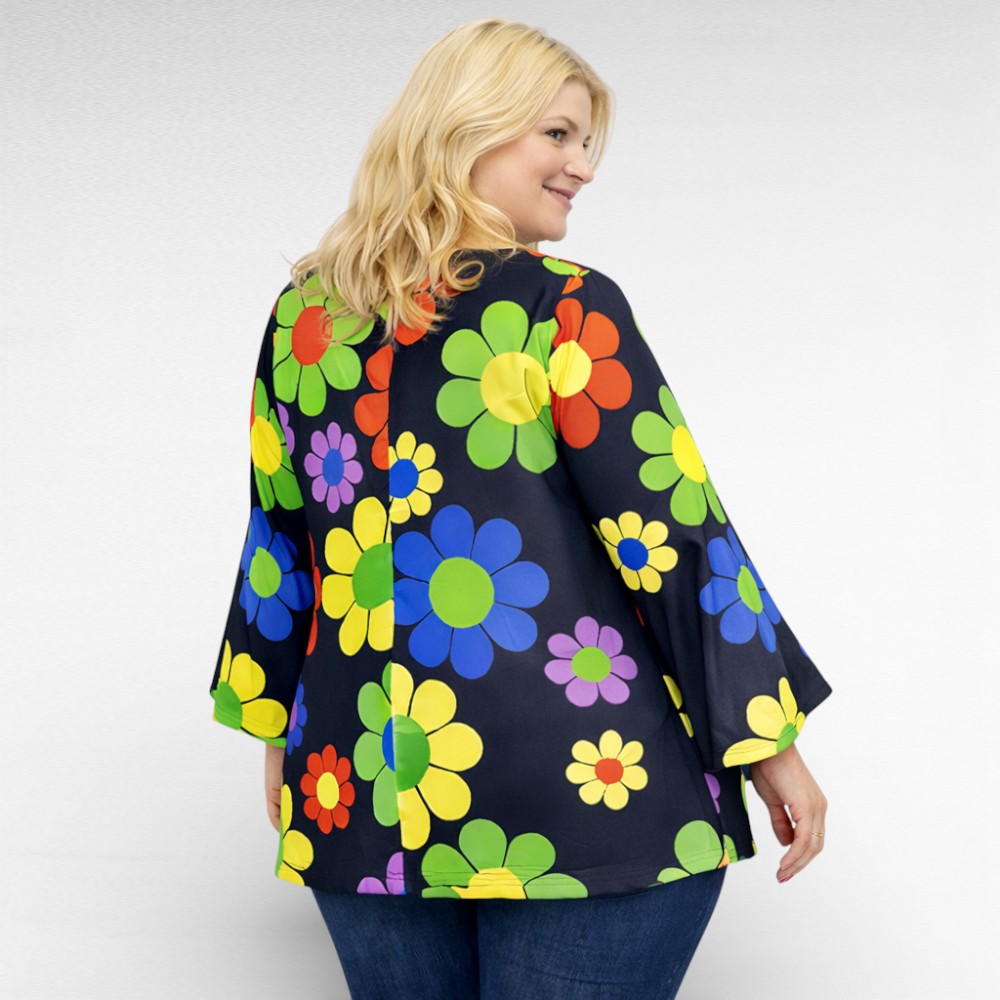 Must erksavärvilise suure lillemustriga alt laienevate varrukatega pluus “Dagne”. Külgedel all umbes 10cm pikad lõhikud. Sirge lõikega. Mõnus pehme materjal, ei kortsu.