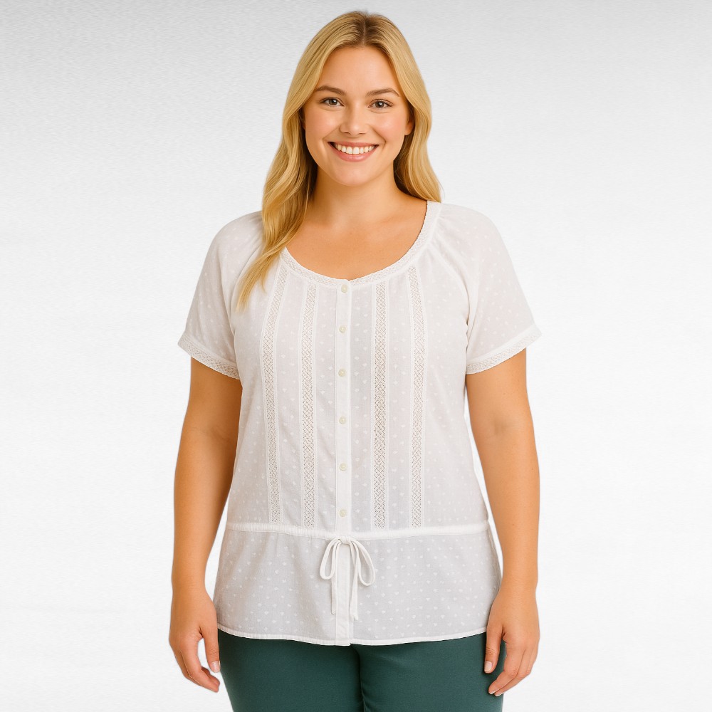 Valge rohke pitsiga kaunistatud raglaanlõikega lühikeste varrukatega eestnööbitav keskelt tunnevööga pluus firmalt “H&M”. Hea pikkus, sobib nii seeliku kui pükstega.