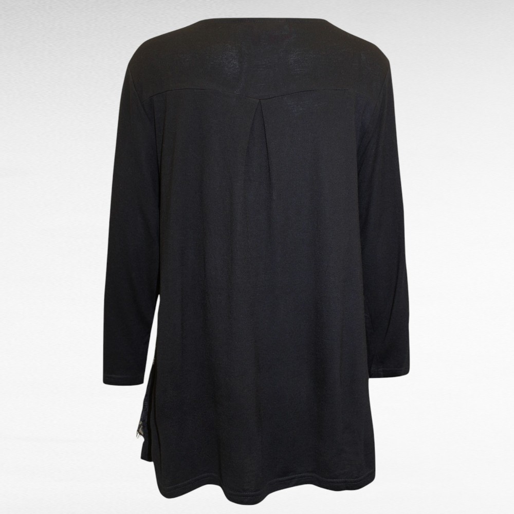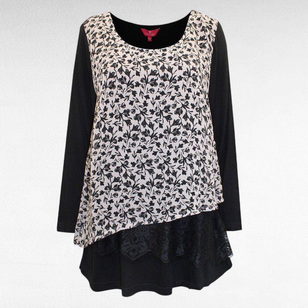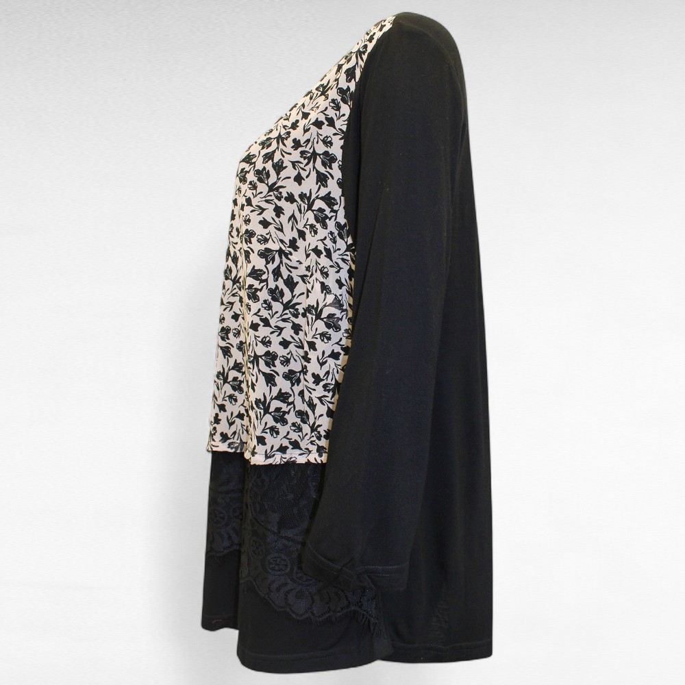 Väga kaunis ja naiselik musta-ja hallikirju alt musta pitsiribaga rinnaosast sifoonkangaga pikkade varrukatega alt veidi laieneva tegumoega pluus Inglismaalt firmalt “Together”.