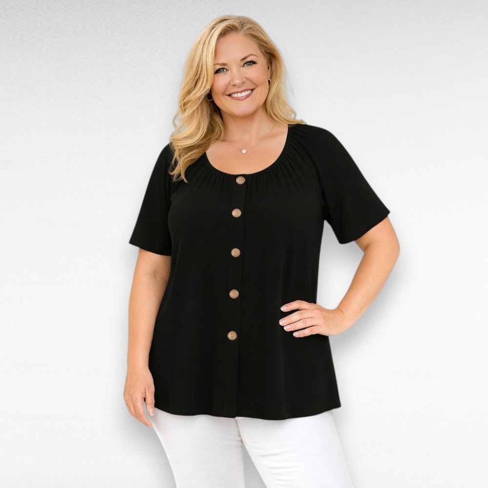 Väga mõnusast stretchikast materjalist raglaanlõikega lühikeste varrukatega eest armsa dekoratiivse nööbireaga alt kõvasti laieneva tegumoega pikem pluus Inglismaalt firmalt “Evans”. Avaram kaelus, kaeluse ääres on kumm, saab kanda ka õlgade peale venitatuna.