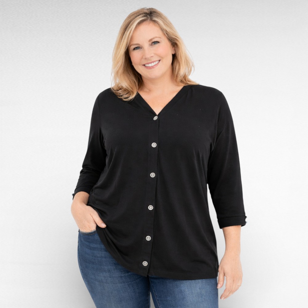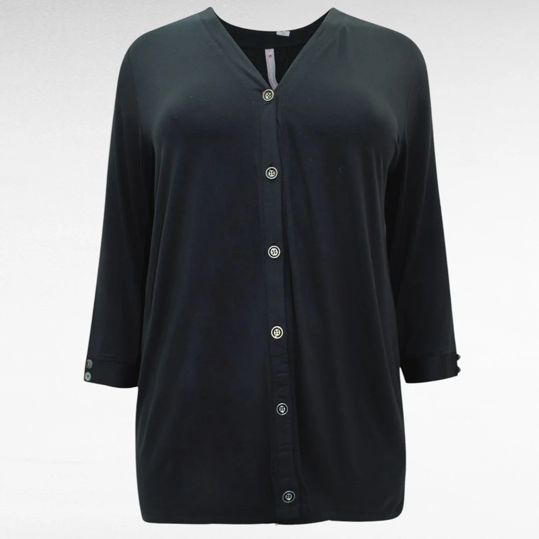 Pehmest paksemast puuvillasest materjalist soliidne V-kaelusega must eest nööpidega pikem poolpikkade varrukatega pluus Inglismaalt firmalt “Blancheporte”.