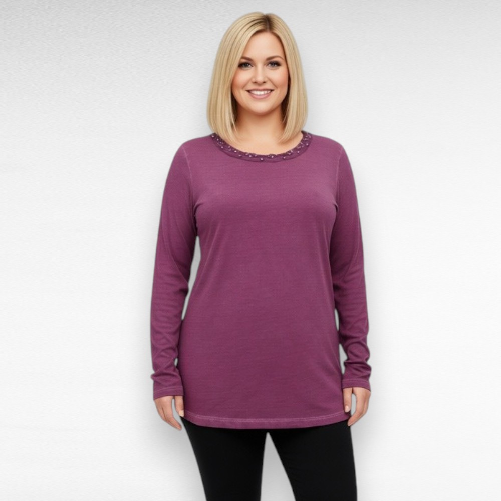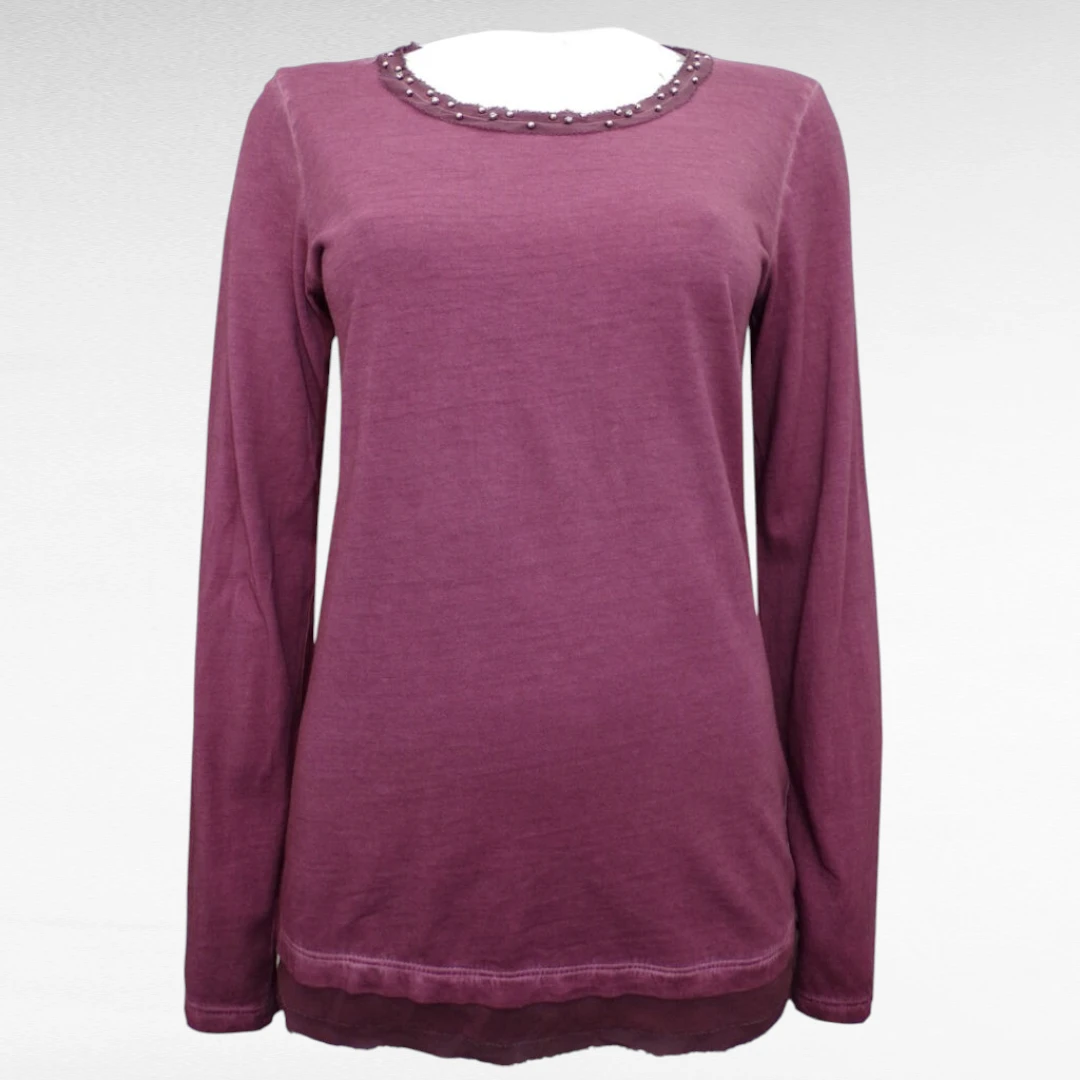 Mõnusast nahasõbralikust pehmest täispuuvillasest materjalist ülevalt kauni kivikestega ehitud kaelusega ploomilillad hajutatud toonidega pikkade varrukatega pluus Inglismaalt firmalt “S.OIiver. Allääres kaunis õhuke sats.